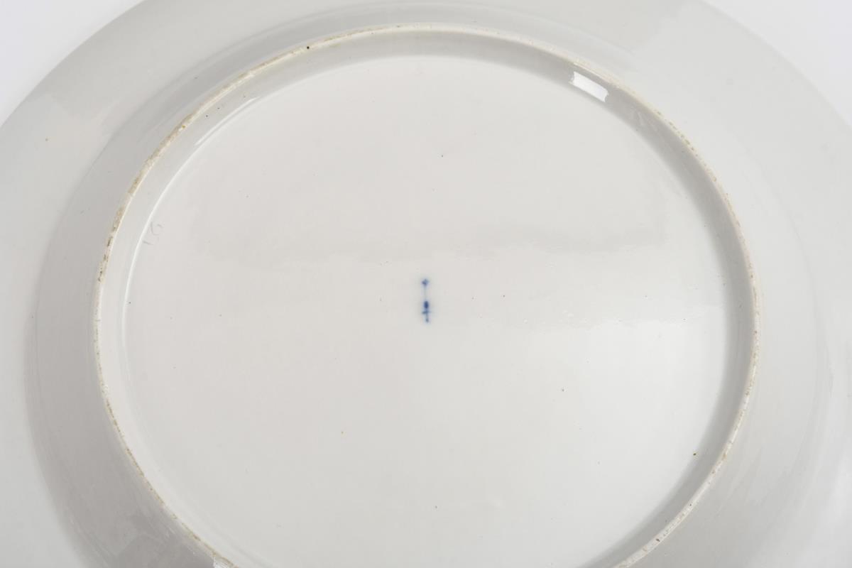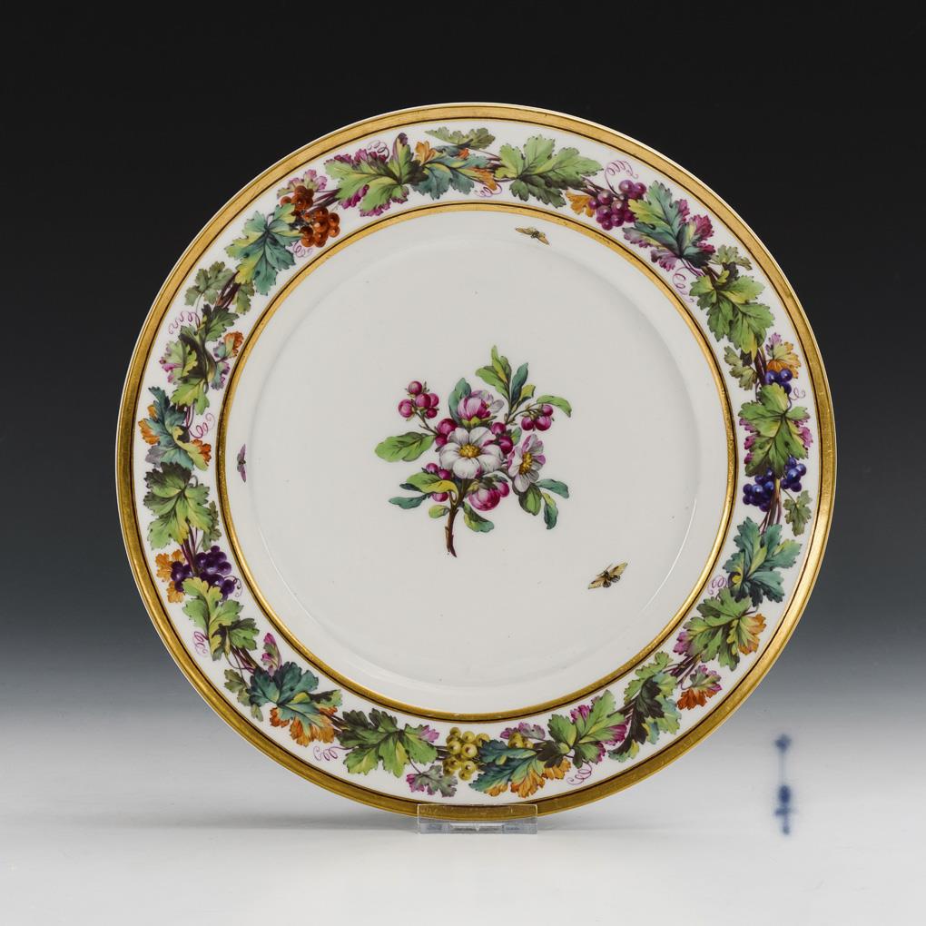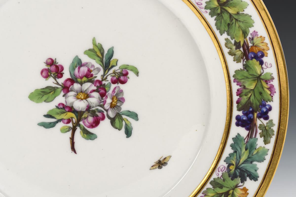 Modell "Antik glatt". Auf der Fahne zwischen Goldrändern leuchtend farbig gemalte Weinreben, im Spiegel ein blühender Apfelzweig sowie Kalitten. Wohl aus einem Service für Johann Friedrich Ritz, Kämmerer König Wilhelms II. von Preußen und Ehemann der späteren Gräfin Lichtenau. Unterseitig minimaler Randchip.