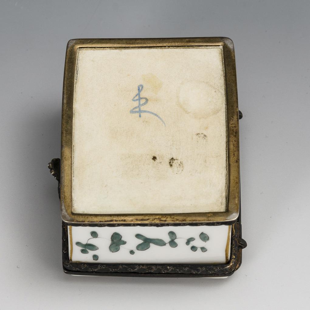 Rechteckiger Dose mit der Darstellung eines Vogelpaares auf dem Deckel, allseitig kupfergrüne, indianische Blumenmalerei. Minimale Goldbereibung auf dem Deckel.