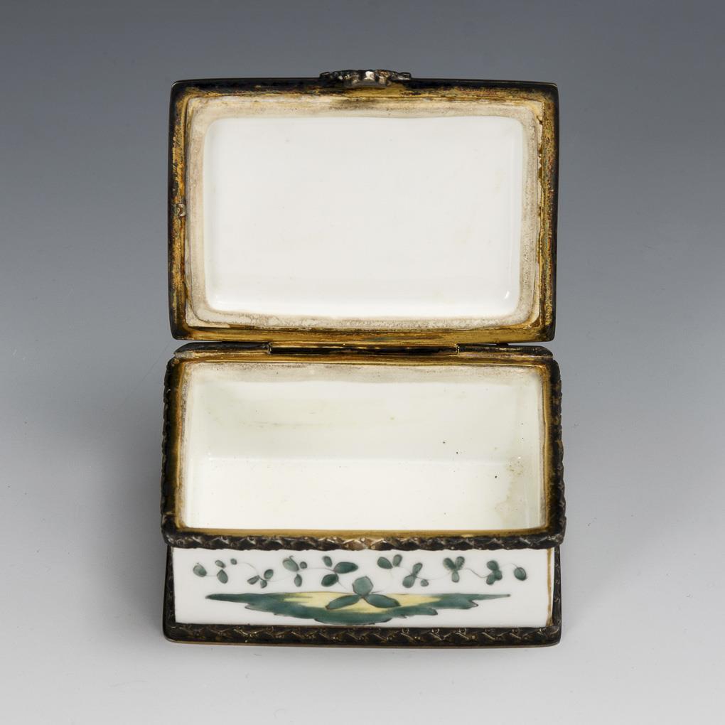 Polychrom bemalt, goldstaffiert, vergoldete Silbermontierung. 3,4 x 7,5 x 5,5 cm.