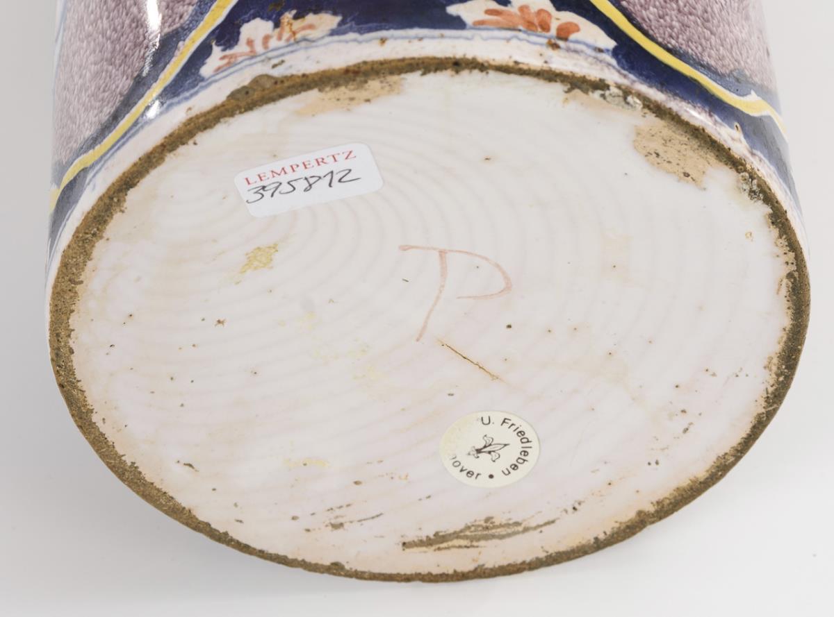 Zylinderkrug mit Bandhenkel. Schauseitig ein Bauer auf dem Feld in einer runden, blumengeschmückten Reserve. Zinndeckel mit Muscheldrücker. Partiell minimale Glasurdefekte und -bereibungen, jünger ergänzte Zinnmontierung, teils repariert.