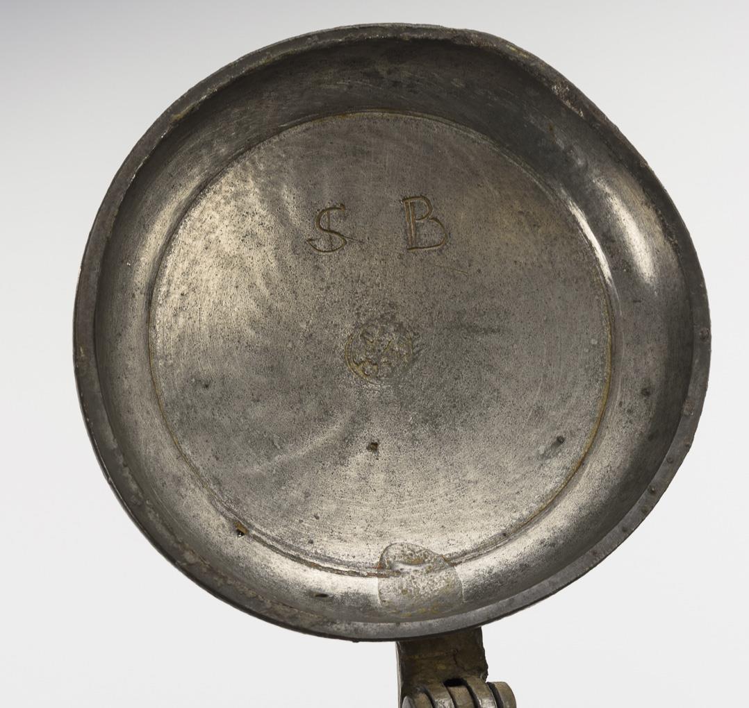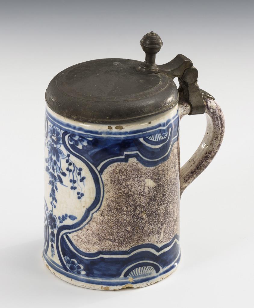 Zylinderkrug mit Bandhenkel. Schauseitig eine geschweifte Reserve mit Blumenmalerei. Zinndeckel mit Kugeldrücker, innen graviert "SB" und gepunzt, Leinenfleck. Teils Glasurdefekte und -bereibungen, Zinn mit Altersspuren.