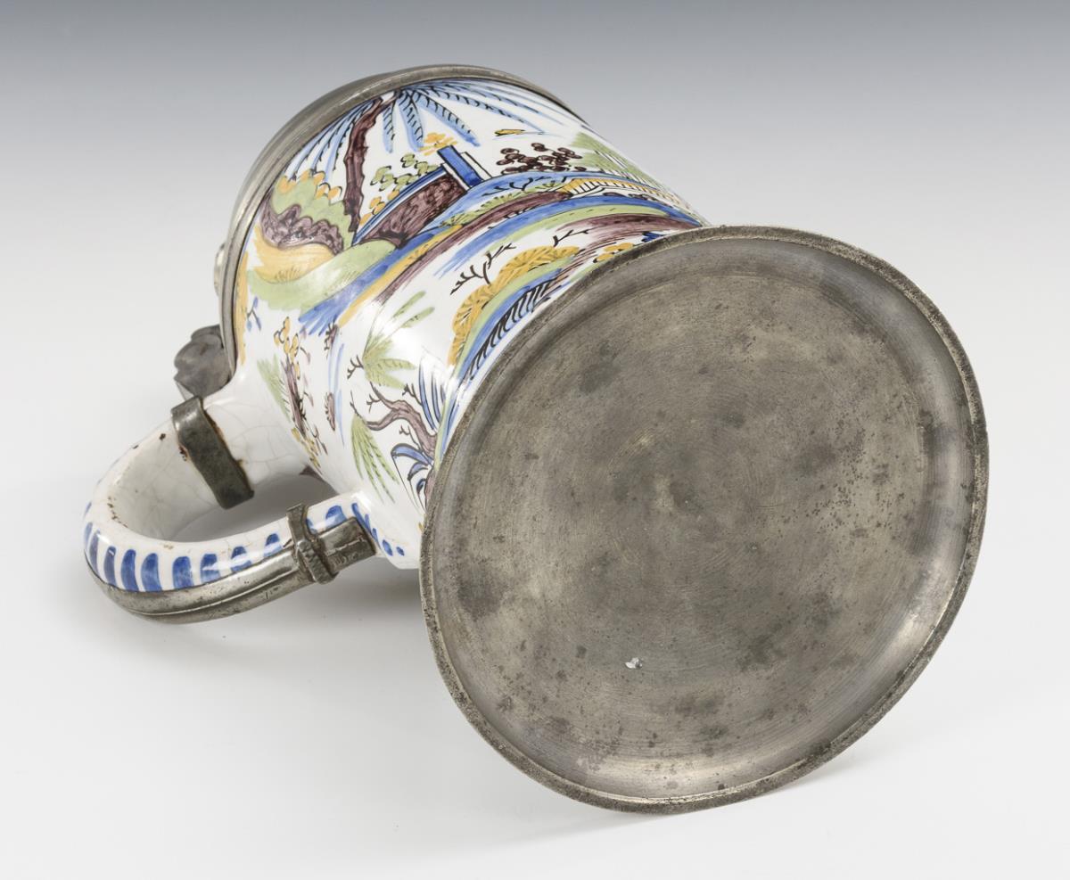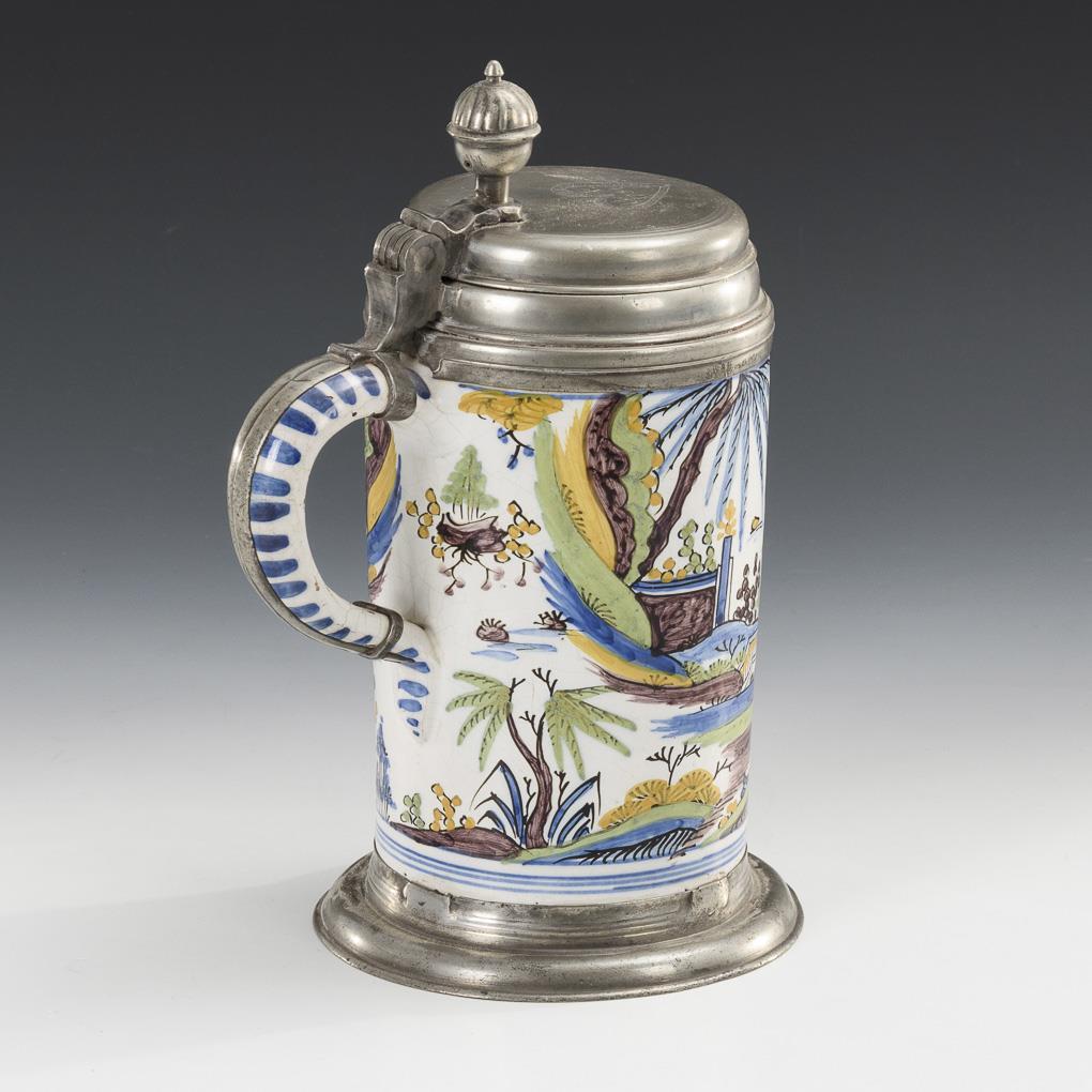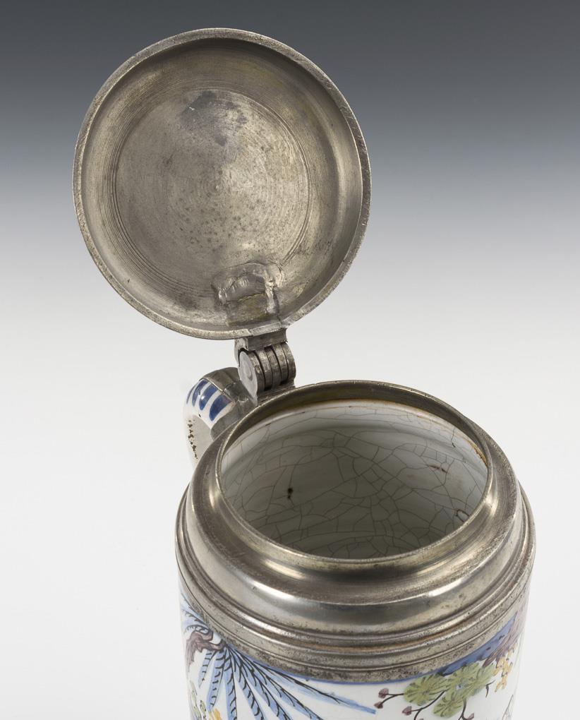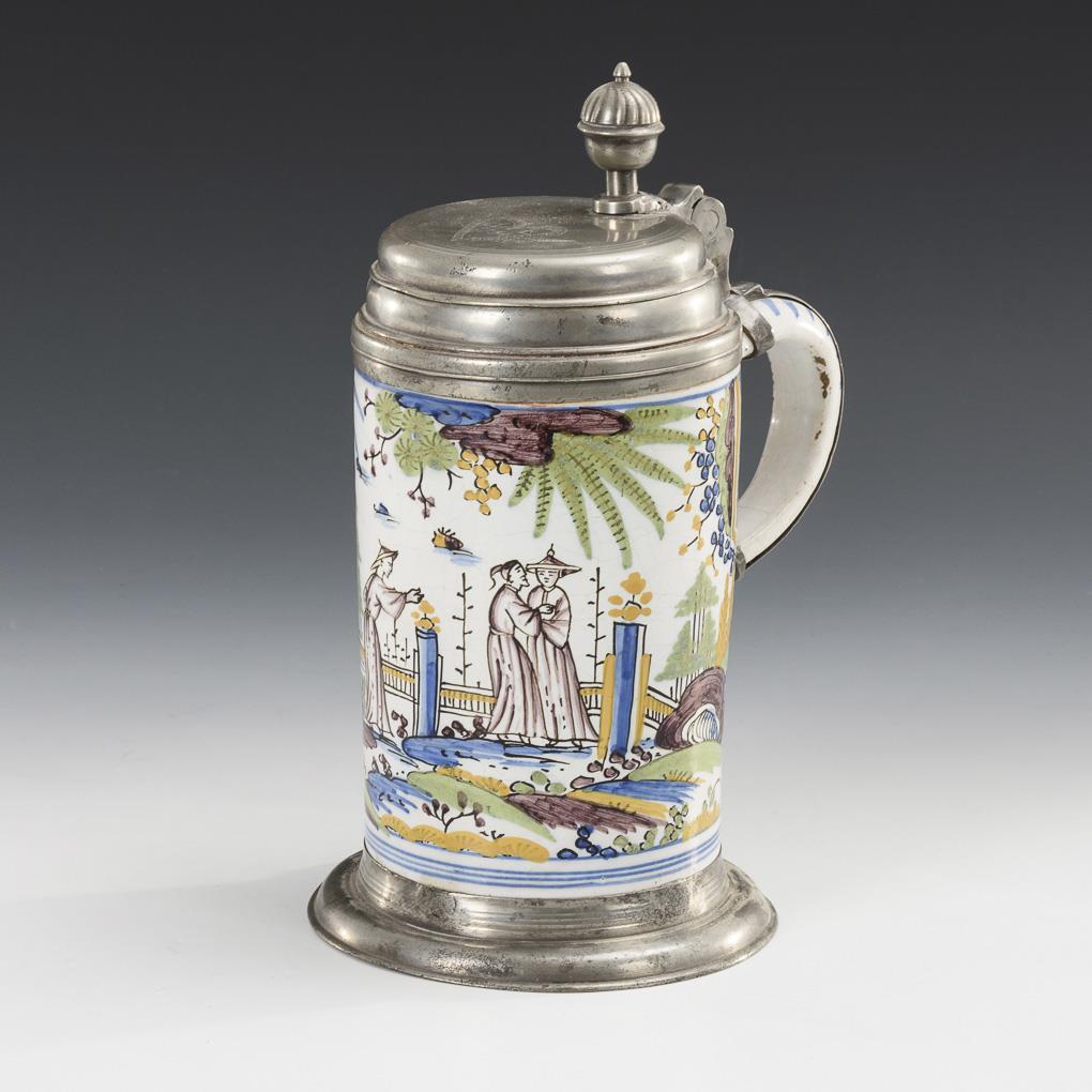 Zylinderkrug mit strichverziertem Bandhenkel. Schauseitig eine asiatisierende Figurenszene in stilisierter Landschaft. Zinndeckel mit Kugeldrücker und Herzgravur "HL 1734", Zinnstand. Partiell Glasurdefekte, Altersspuren und Defekte am Zinn.