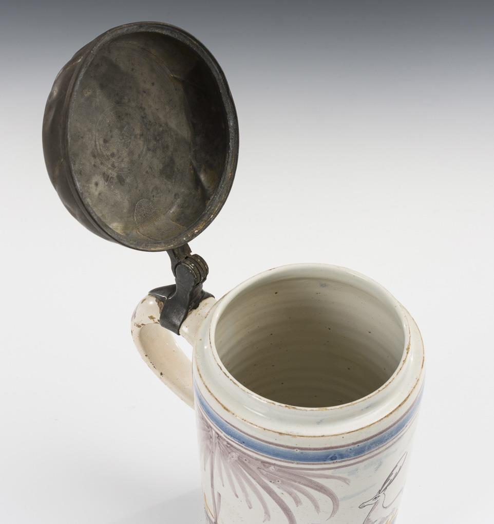 Zylinderkrug mit verziertem Bandhenkel. Schauseitig ein Hirsch zwischen Bäumen. Zinndeckel mit Kugeldrücker, innen gepunzt und Leinenfleck. Partiell Glasurdefekte und -bereibungen, Zinn mit Altersspuren.