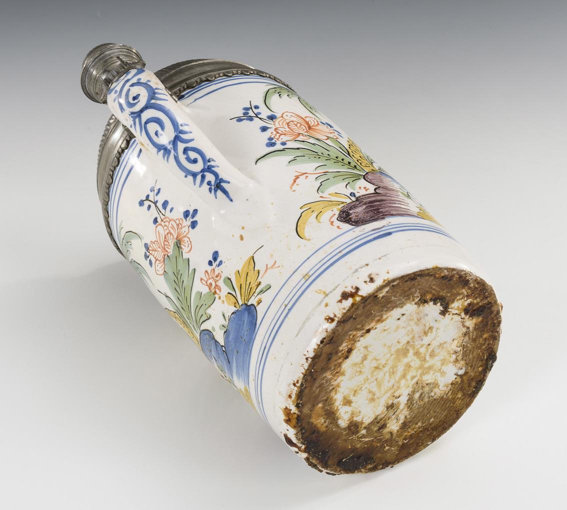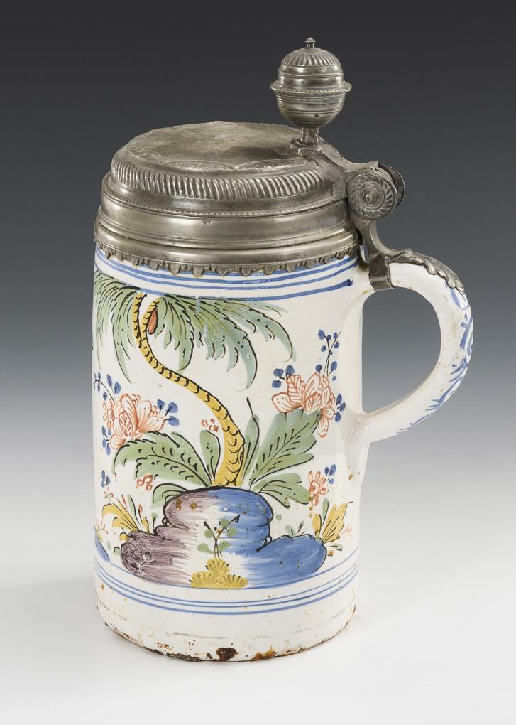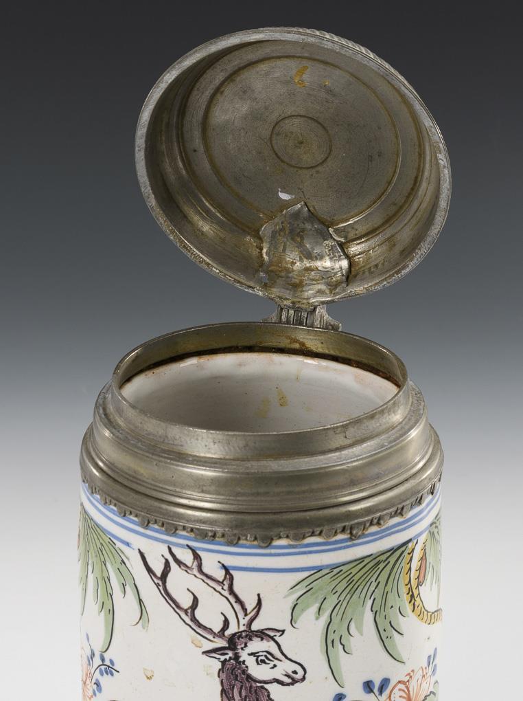 Zylinderkrug mit spiralverziertem Bandhenkel. Schauseitig ein schreitender Hirsch in stilisierter Landschaft. Profilierter Zinndeckel mit Kugeldrücker. Partiell minimale Glasurdefekte und -bereibungen, Altersspuren und Defekte am Zinn, Zinnstand fehlt.