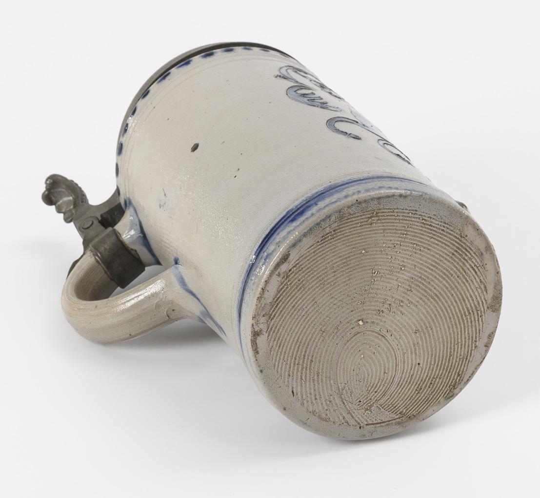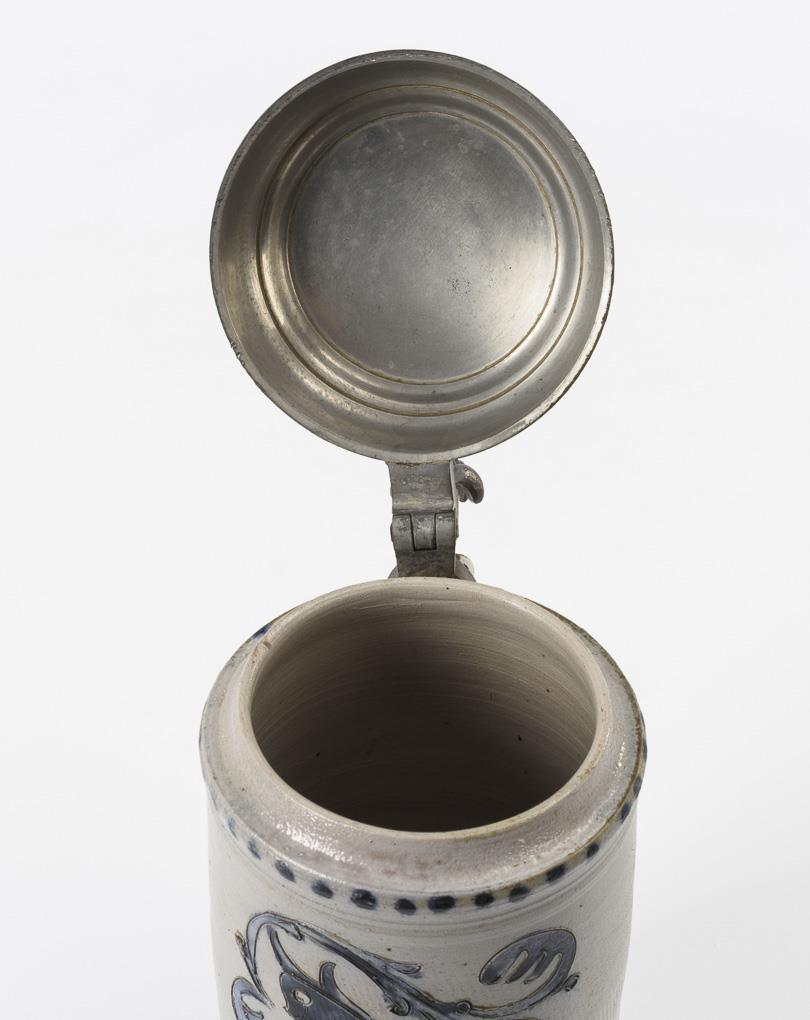 Zylinderform mit glatt ausgestrichenem Ohrenhenkel. Zinndeckel mit Muscheldrücker. Zinn mit Alters- und Gebrauchsspuren, am Stand minimal bestoßen.