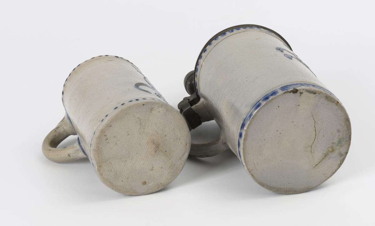 Graues, salzglasiertes Steinzeug mit Ritz- und Stempeldekor, kobaltblauer Bemalung und gepunkteten Reihen. H 16,5 cm und 26,5 cm.