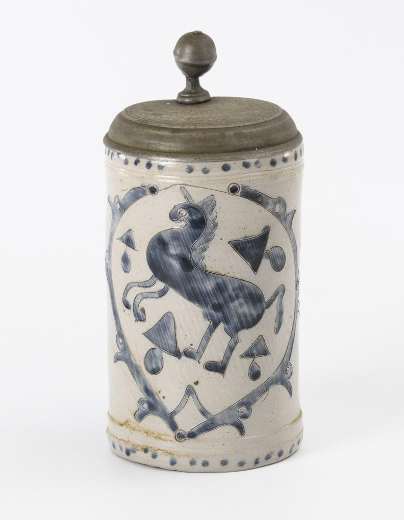 Westerwälder Walzenkrug mit springendem Pferd.