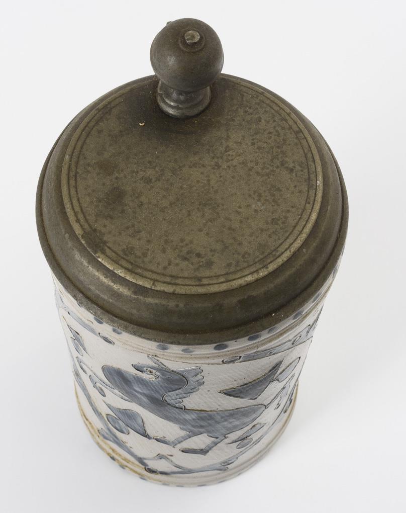 Zylinderform mit spitz ausgestrichenem Ohrenhenkel. Zinndeckel mit Kugeldrücker. Zinn mit Altersspuren und Defekten, partiell feine Wandungsrisse.