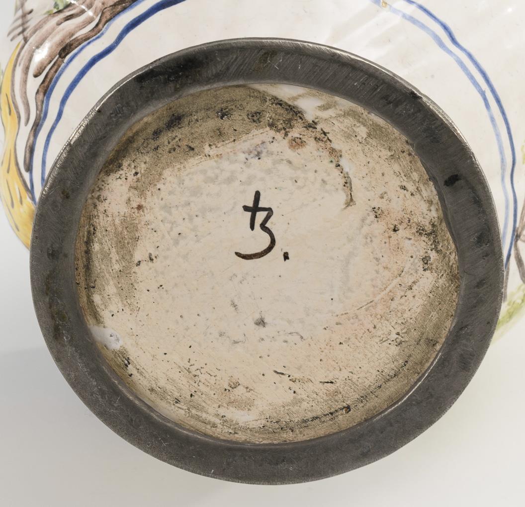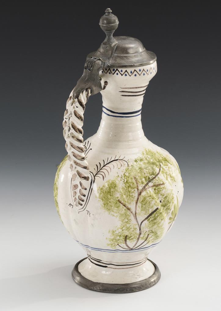Kugelbauchkrug mit godronierter Wandung, trichterförmigem Enghals mit Zopfhenkel, Rundfuß. Schauseitig eine Kirchenarchitektur zwischen Bäumen, am Henkel datiert "1778". Zinndeckel mit Kugeldrücker, Zinnstandring. Partiell Glasur berieben und leicht bestoßen, am Stand geklebt, Zinn mit Altersspuren und Reparaturen.
