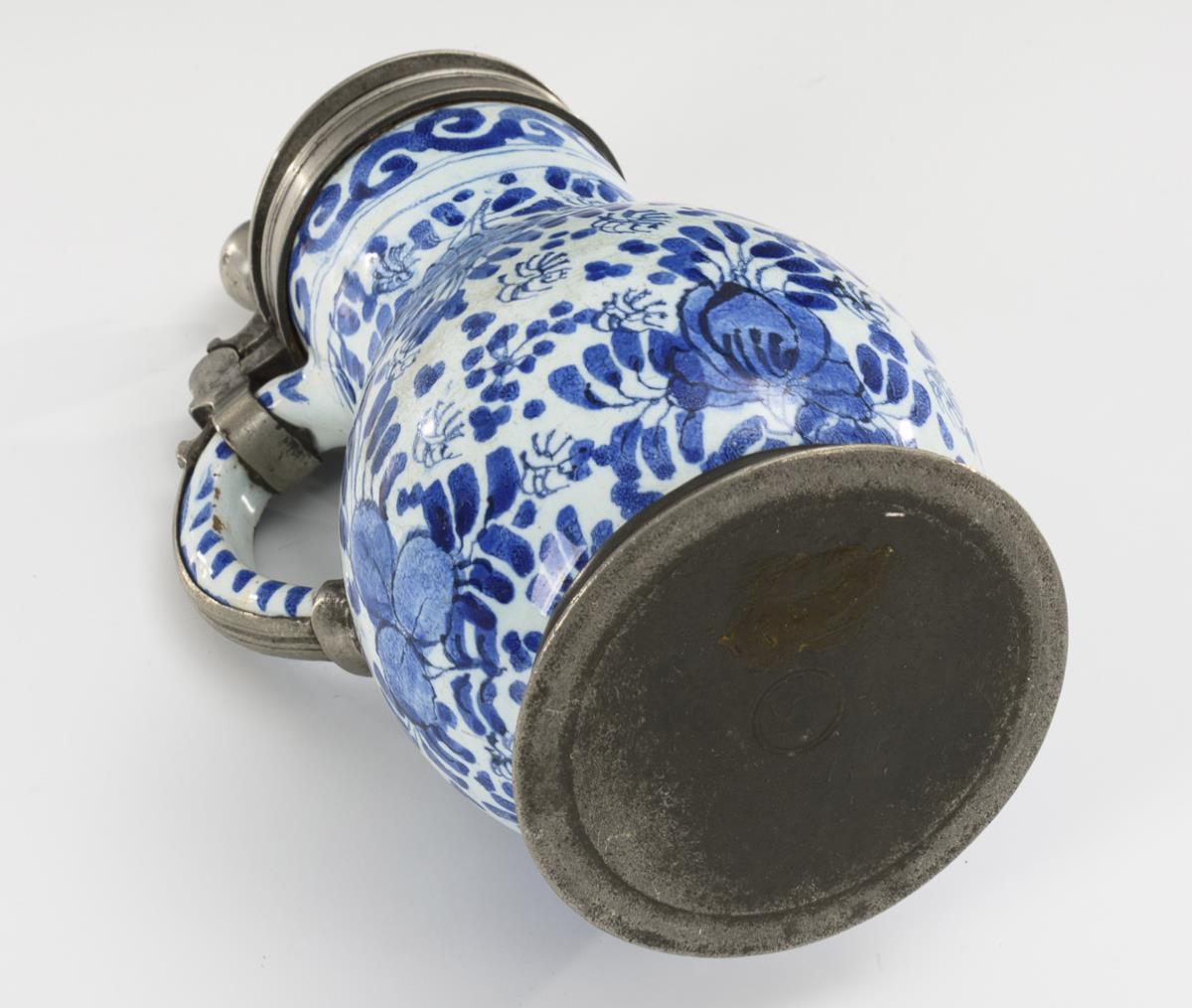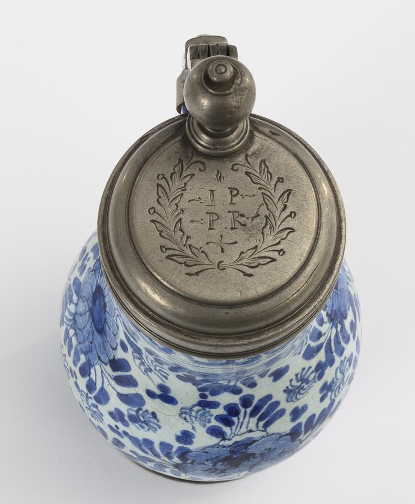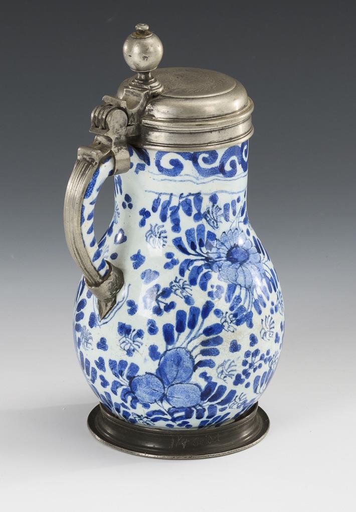 Birnkrug mit Bandhenkel. Umlaufend große und kleine Blüten. Zinndeckel mit Kugeldrücker und Gravuren, Zinnstand. Partiell leichte Glasurdefekte.