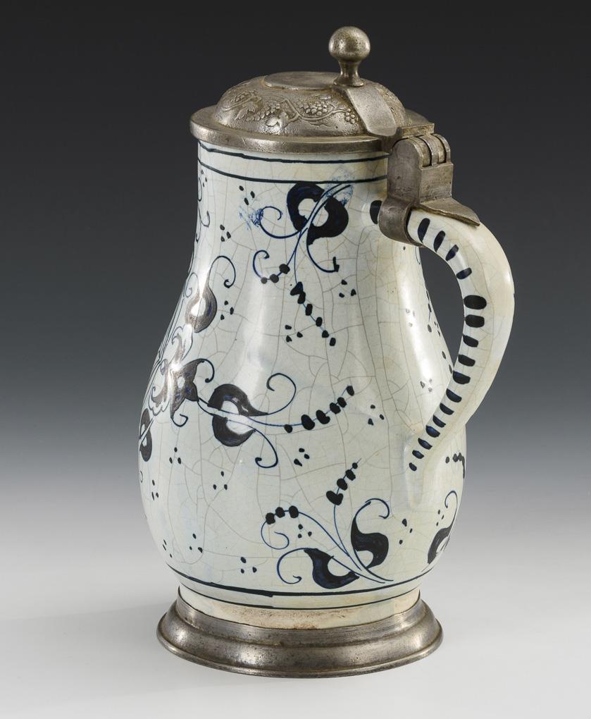 Birnkrug mit Bandhenkel. Schauseitig eine geschweifte Kartusche mit grasendem Pferd. Profilierter Zinndeckel mit Weinlaubreliefs und Kugeldrücker, gepunzt, Zinnstandring.