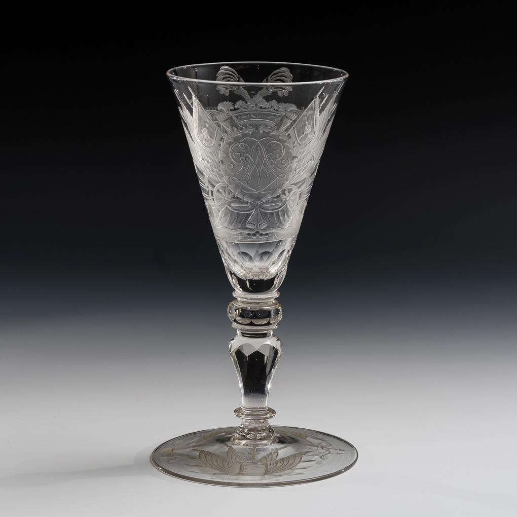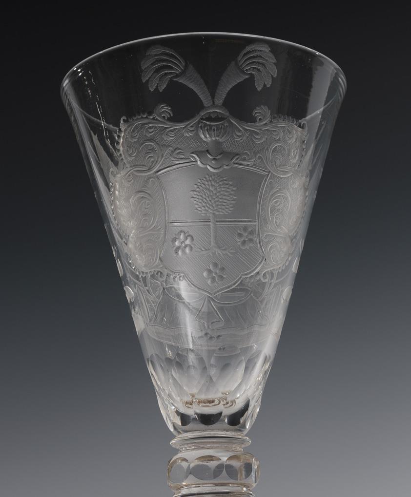 Konische, am Ansatz wabenfacettierte Kuppa, facettierter Nodus und Balusterschaft, Rundfuß. Schauseitig das ligierte Monogramm "GWvL" unter einer Krone, gerahmt von Trophäen, verso das Wappen der Grafen von Lindenau.