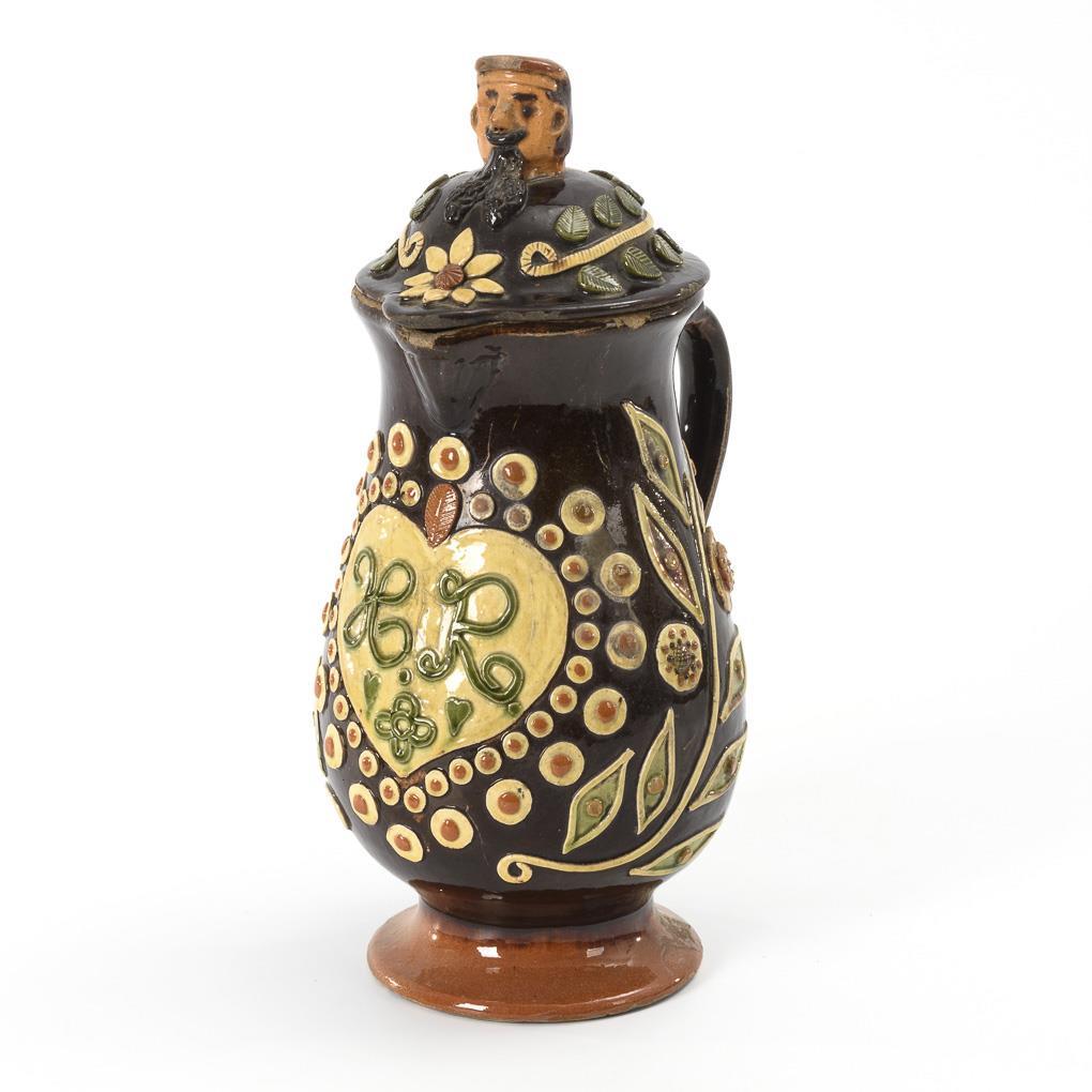 Bauchige Kanne mit spitzer Schneppe und Ohrenhenkel, schauseitig ein Herzmotiv mit Monogramm HR. Deckel mit Männerkopf als Knauf. Partiell Defekte, Alters- und Gebrauchsspuren.