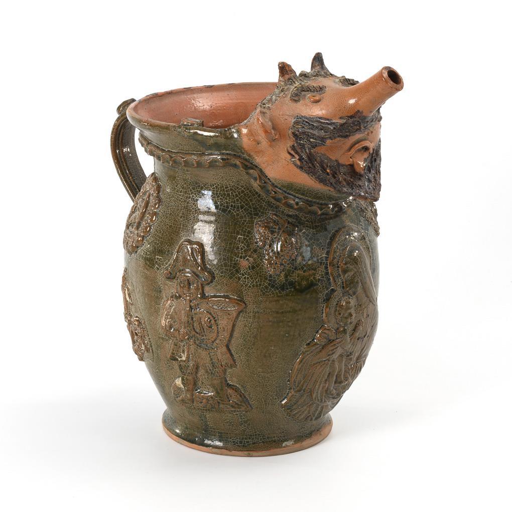 Bauchige Kanne mit aufgelegtem Reliefdekor, u.a. sakrale Mutter-Kind-Darstellung, historisierende Musikanten und Weintrauben, Bandhenkel und figürlichem Ausguss in Form einer bärtigen (Teufels-)Fratze mit langer Tülle als Nase.