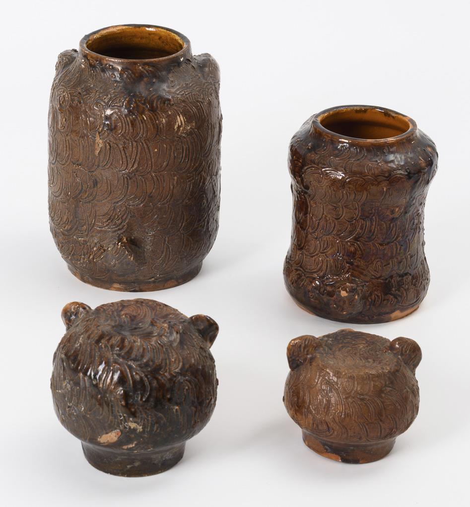 Zylindrische Töpfe in Form von sitzenden Bären mit geritztem Fell und nach vorn gelegten Tatzen. Deckel als abnehmbarer Bärenkopf mit ausgestreckter Zunge. Partiell leicht bestoßen.