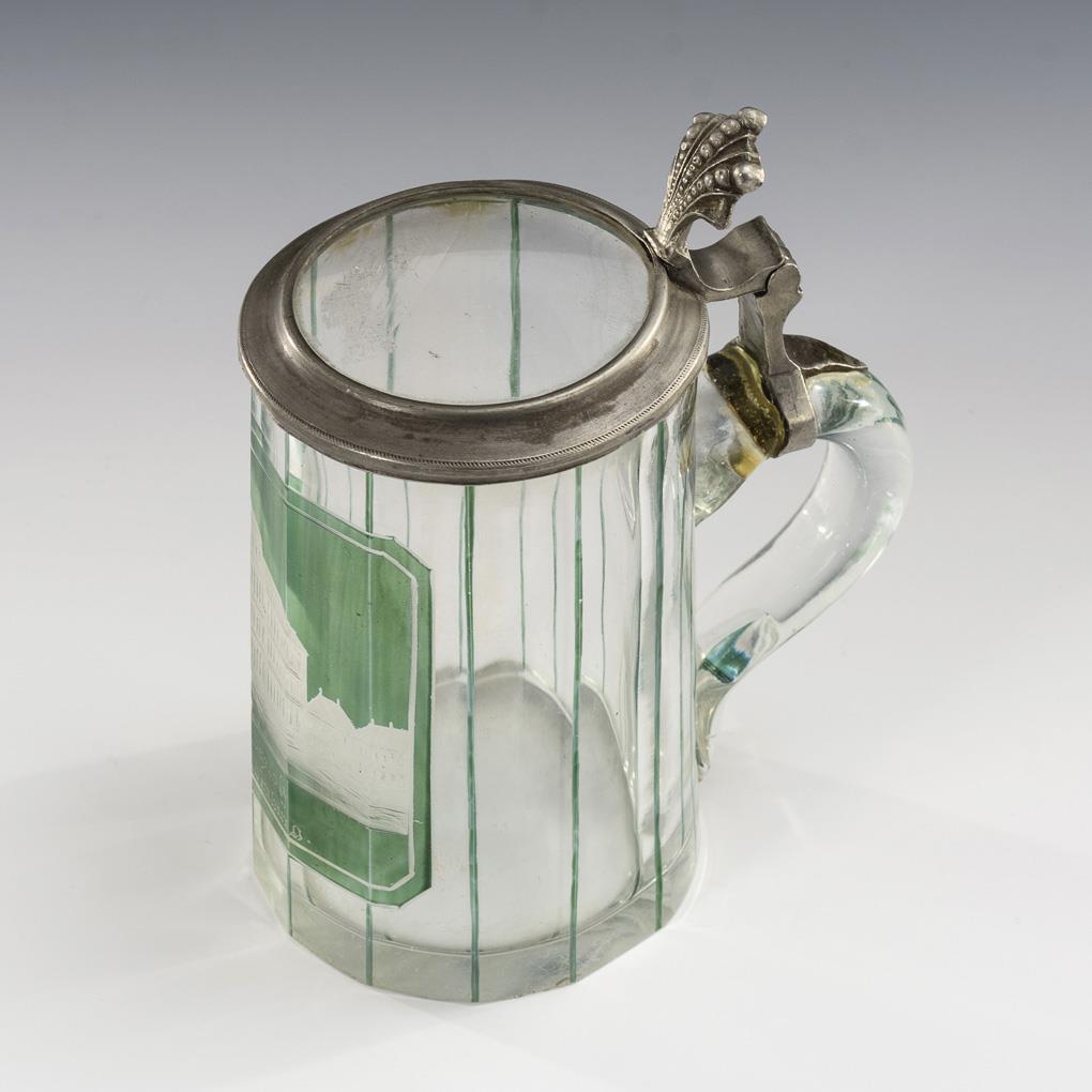 Leicht konischer, facettierter Krug mit zinnmontiertem Scharnierdeckel mit Glaseinsatz. Schauseitig eine Kartusche mit einer gravierten und bezeichneten Ansicht von Schloss Oldenburg. 2 Bestoßungen am Stand, Zinnmontierung am Rand etwas verbogen.