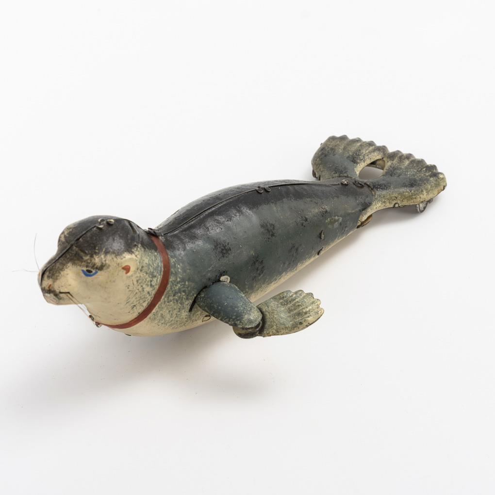 Mechanische Seehundfigur mit intaktem Werk und Schlüssel. Kaum bespielt, Karton mit Defekten.
