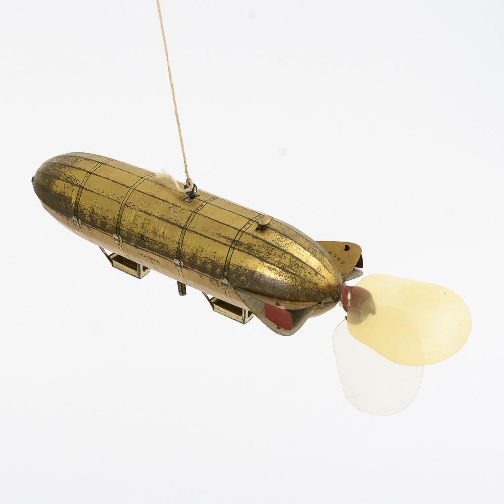 Goldfarben lithografierter Zeppelin mit intaktem Werk und festem Schlüssel. In Originalkarton mit handschriftlicher Bemerkung: "German Zeppelin made in 1906. Christmas gift to John Oldenburg 1912". Berieben, 1 Ersatz-Propellerblatt anbei.