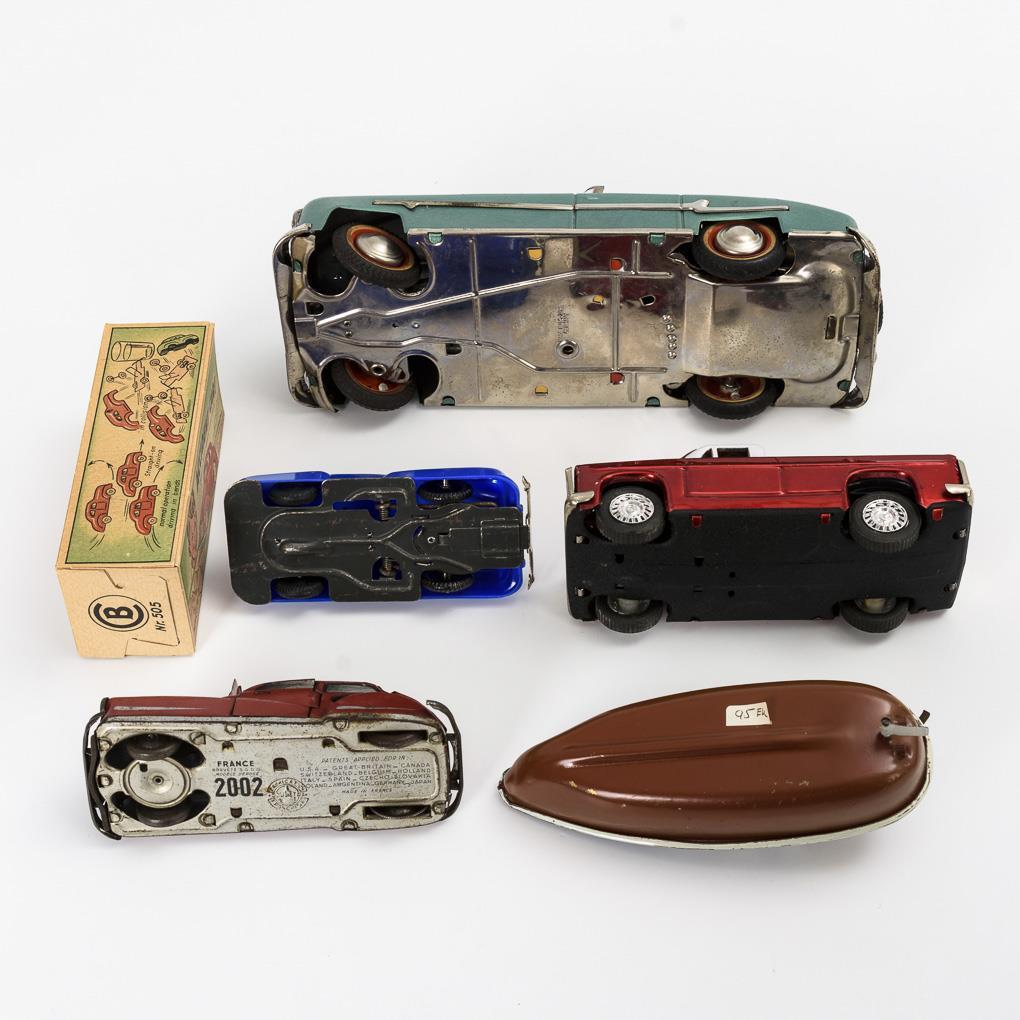 Grüne Limousine mit defektem Werk (L 25,5 cm). / Rotes Blechauto "Joustra, Nr. 2002" mit intaktem Werk und automatisch öffnender Tür und Frontklappe (L 13,5 cm). / Blaues Kunststoff-Auto "Accident Car, BC 1950" im Originalkarton (L 12 cm). / Roter Pickup (L 15,5 cm). / Blechboot mit Kerzenantrieb (L 16 cm). Altersspuren und Defekte.
