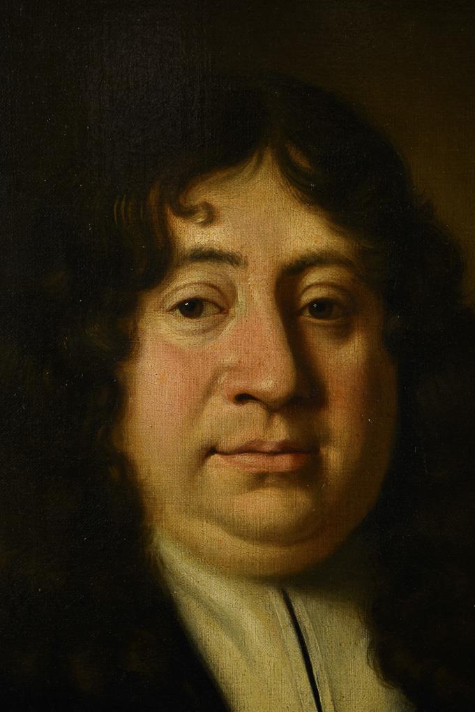 Porträt eines Mannes in schwarzer Robe mit dunkel gelocktem, langem Haar vor neutralem Hintergrund. Leinwand doubliert.