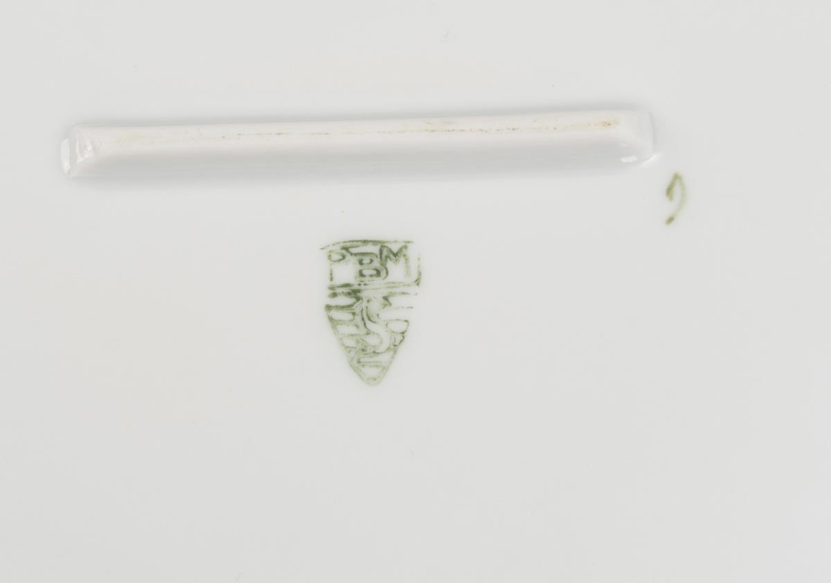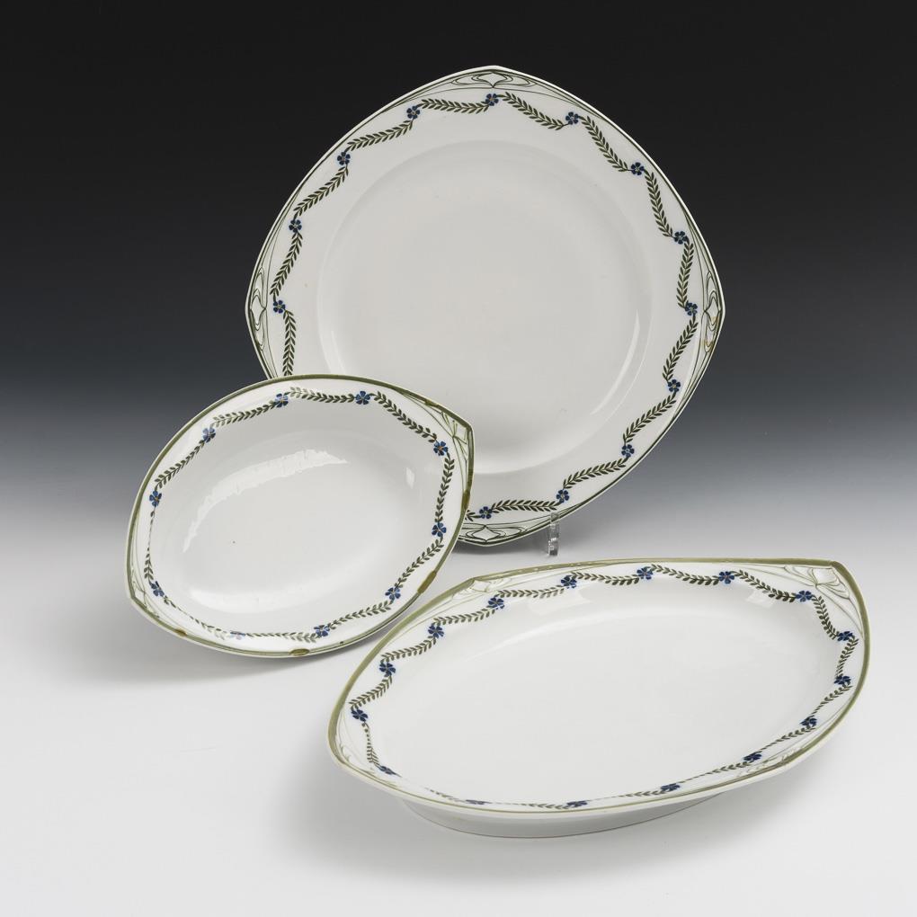 Dekor "Augusta" (bisher als Girlanden-Dekor bezeichnet), Form "1905" (fabrikinterner Name "Eckform"). 1 Rundplatte (Ø 33 cm), 1 Ovalplatte (L 40,5 cm) und 1 Ovalschale (L 27,5 cm). Schale mit herstellungsbedingten Glasurdefekten am Rand.