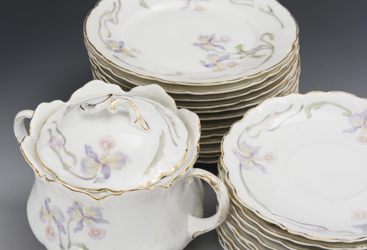 34 Teile. Kaffeekanne (H 25 cm), Milchkännchen, Zuckerdose, 8 Tassen, 11 Untertassen und 12 Kuchenteller. Partieller Goldabrieb, Milchkännchen, 2 Kuchenteller und 1 Untertasse mit Haarriss, Chip an 1 Untertassenrand und am Zuckerdosenstand, Bestoßung an 1 Tassenstand und am Milchkännchenstand.