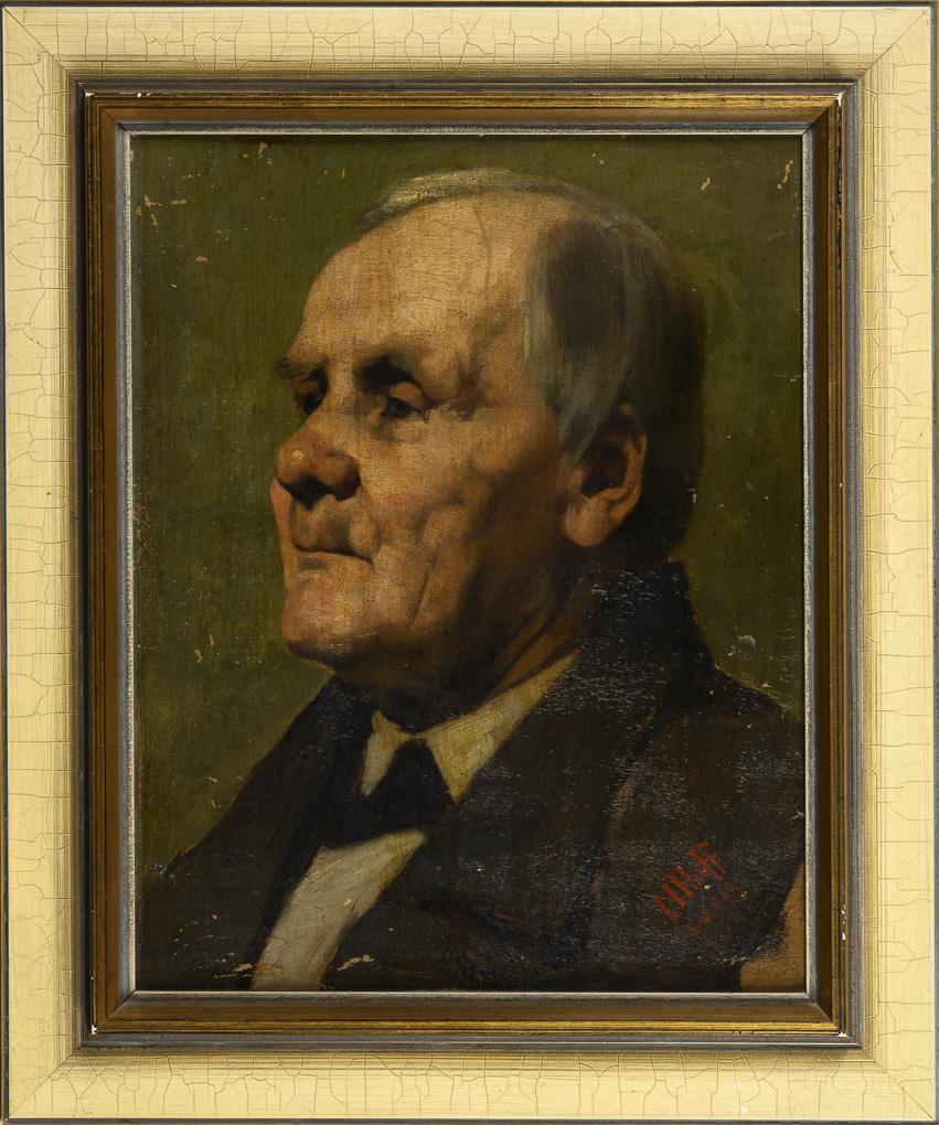 Bildnis eines älteren Mannes mit weißem Haar vor neutralem Hintergrund. Kratzer, Farbabsplitterungen.