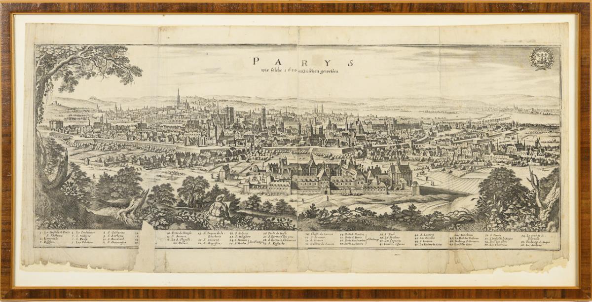 Reich dekorierte, historische Darstellung der Stadt Paris aus der Zentralperspektive, bezeichnet "Parys wie solche 1620 anzusehen gewesen", mit Legende; aus Johann Ludwig Gottfrieds "Neuwe Archontologia Cosmica" (Die Beschreibung aller Reiche der Erde), 1638. Restauriert mit Defekten, verschmutzt und stockfleckig.