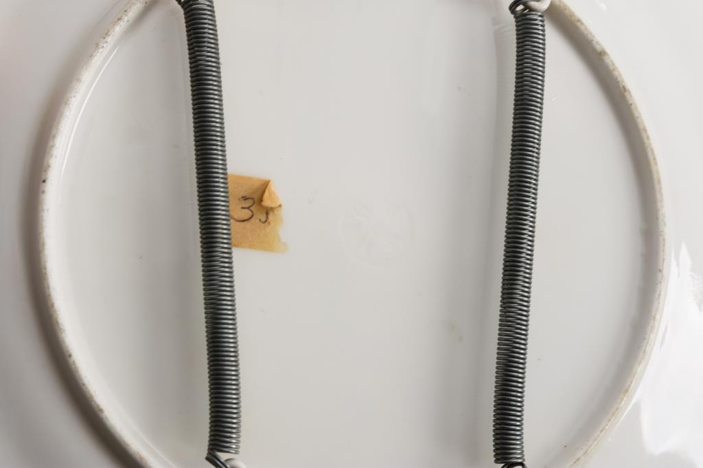 Passige Teller mit rosa Teilfond und reicher Goldmalerei, im Spiegel jeweils eine Passionsblume bzw. Seerose.