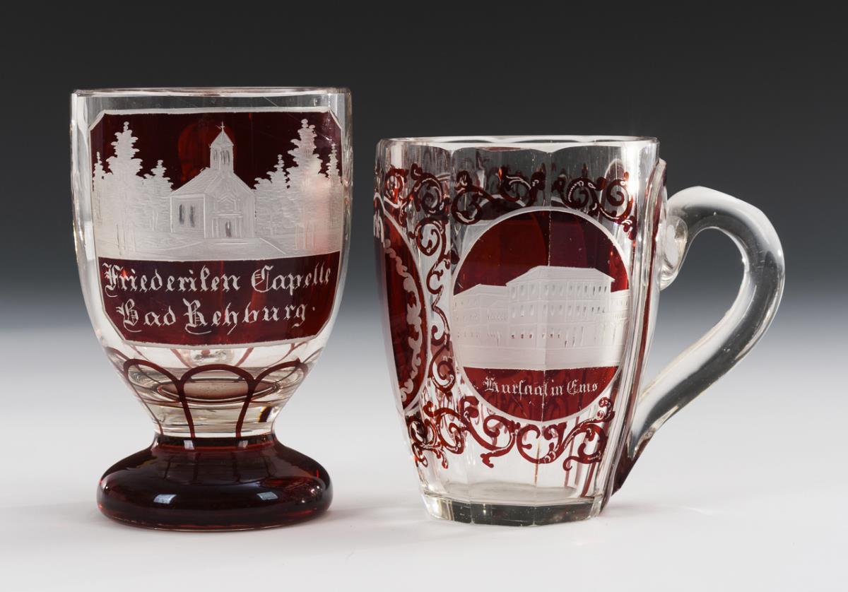 Vier, teils facettierte Henkelbecher und 1 Kelchglas. 4x mit gravierten Ansichten (Rheinstein, Königsborn, Bad Rehburg, Ems) und 1x mit Jagdmotiv. Bestoßung am Fuß des Kelchglases.