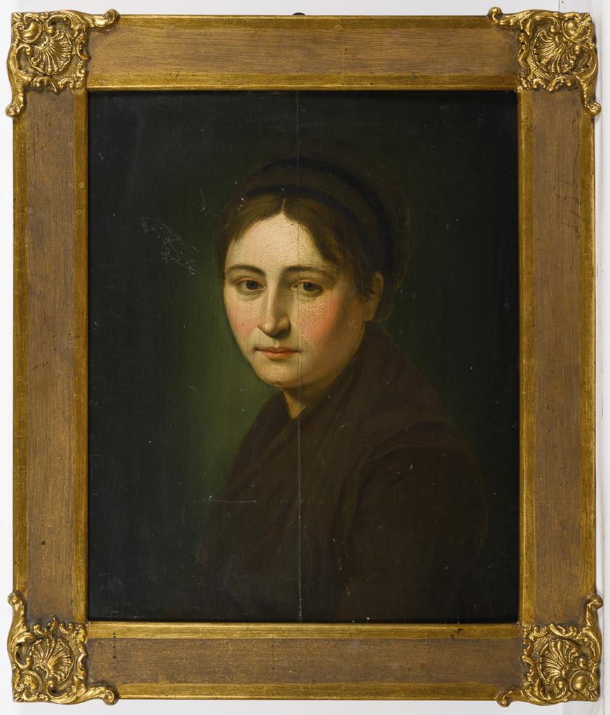 Bildnis einer Frau in einfacher Kleidung vor neutralem Hintergrund. Restauriert.