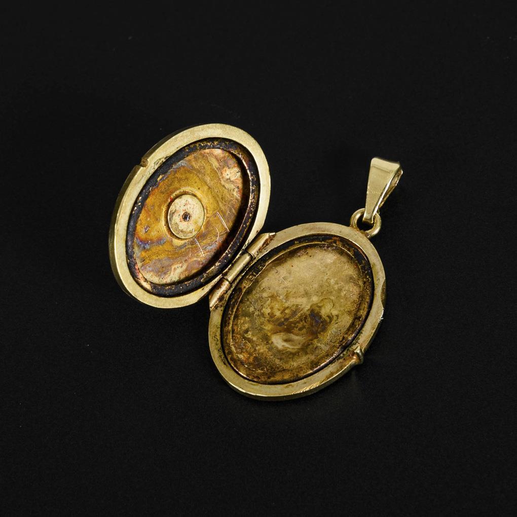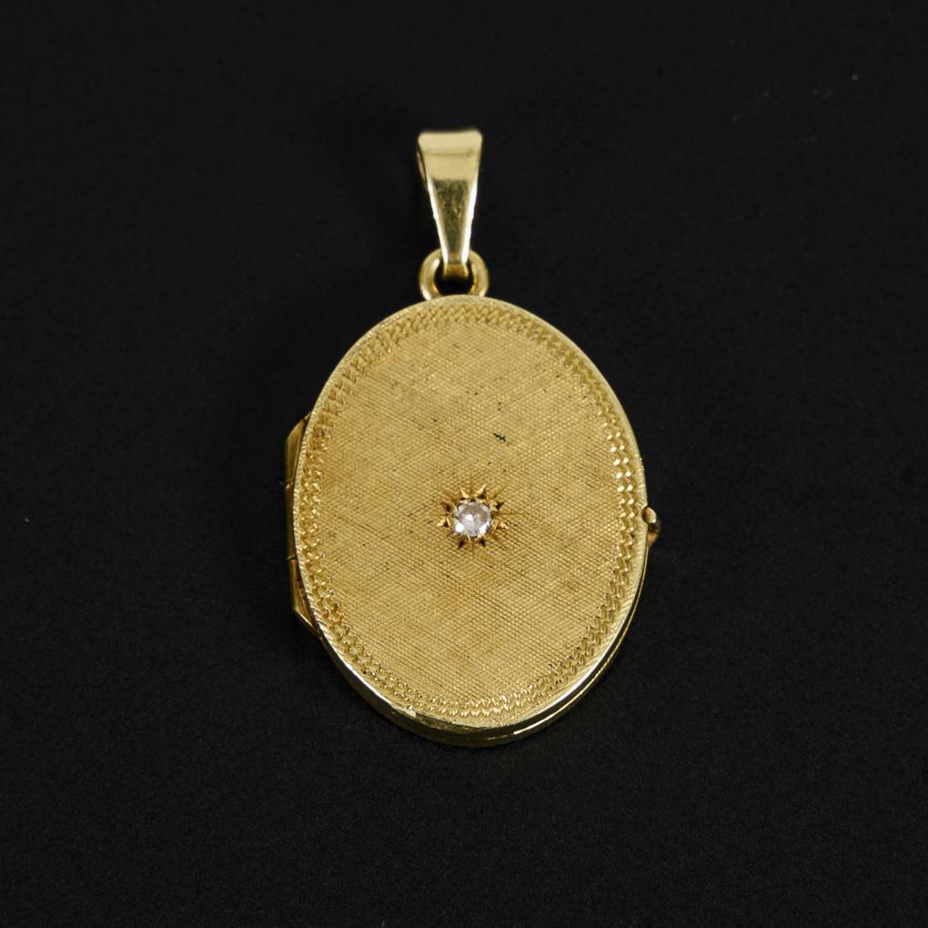 Graviertes Medaillon mit kleinem Diamant. 2 Innenfächer mit Metallrahmen.