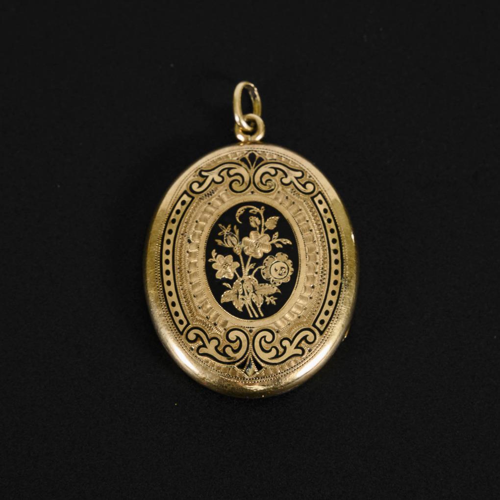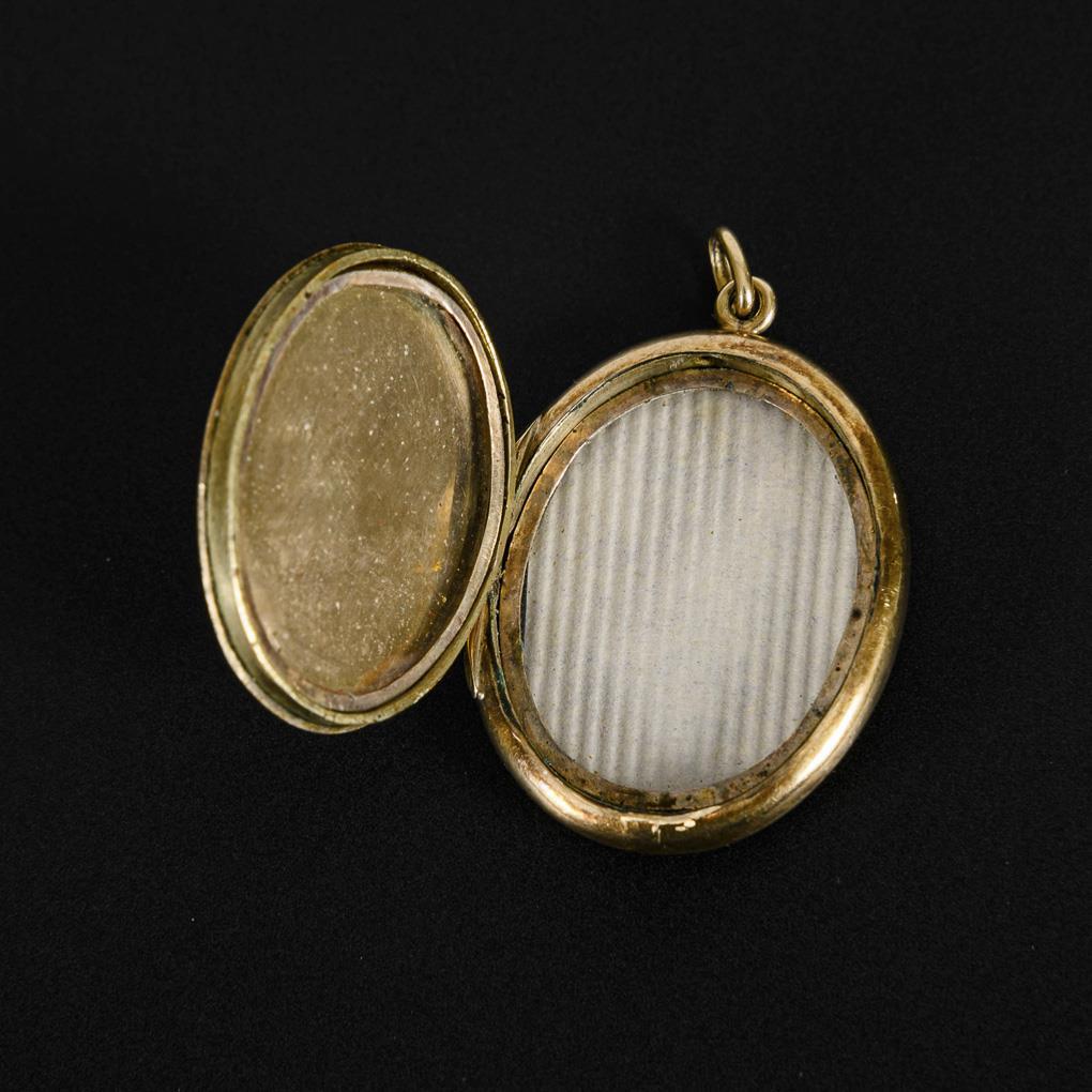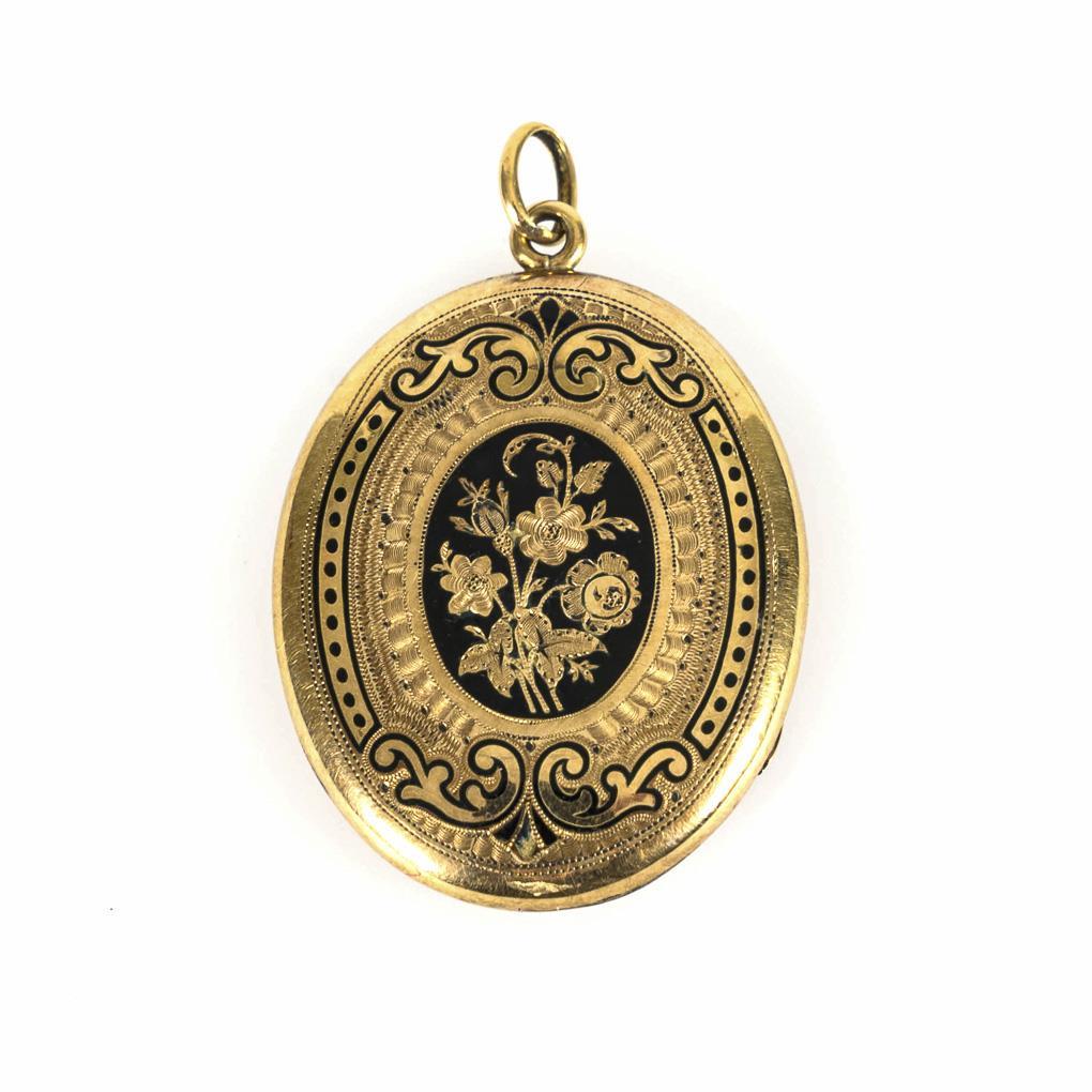 Ziseliertes Medaillon, partiell emailliert. 2 gerahmt verglaste Innenfächer.