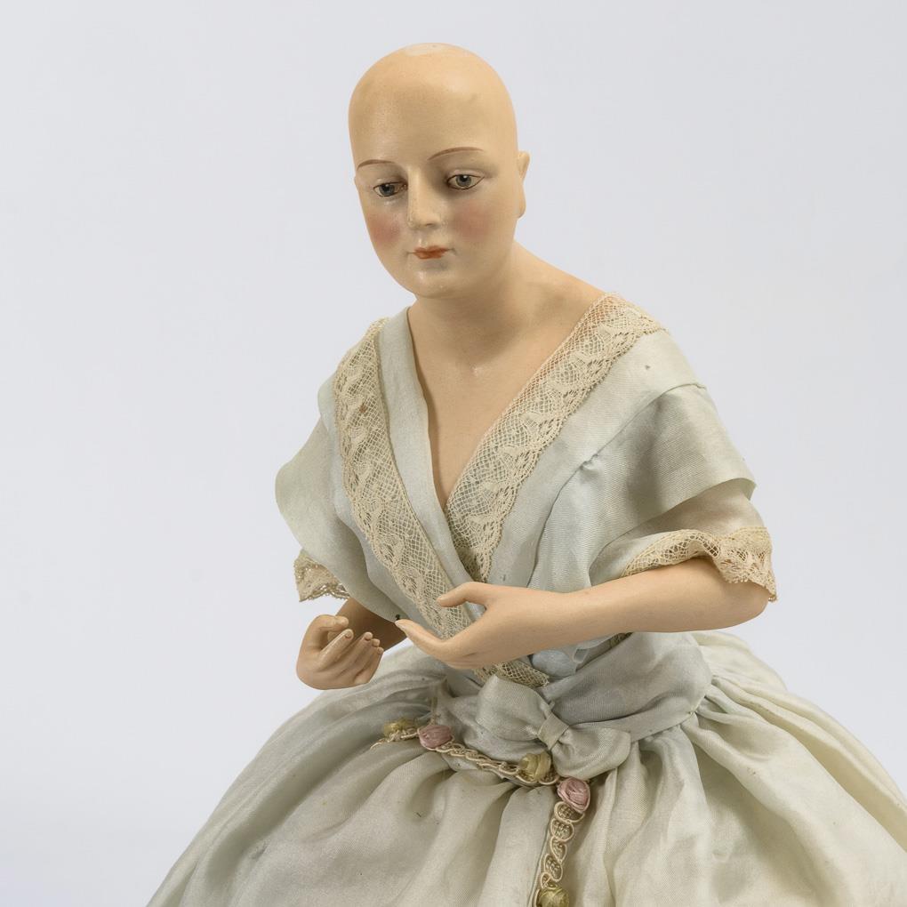 Teepuppenbüste aus Biskuitporzellan, blonde Mohairperücke, originales hellblaues Seidenkleid auf weitem Untergestell. Keine Defekte sichtbar.