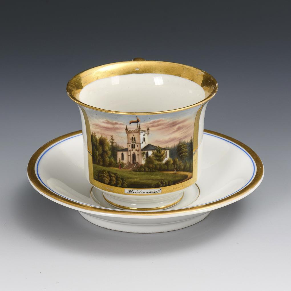 Gefußte Kratertasse mit Ohrenhenkel. Schauseitig eine goldgerahmte Kartusche mit der bezeichneten Ansicht des Jagdschlosses Waidmannsheil bei Bad Lobenstein.