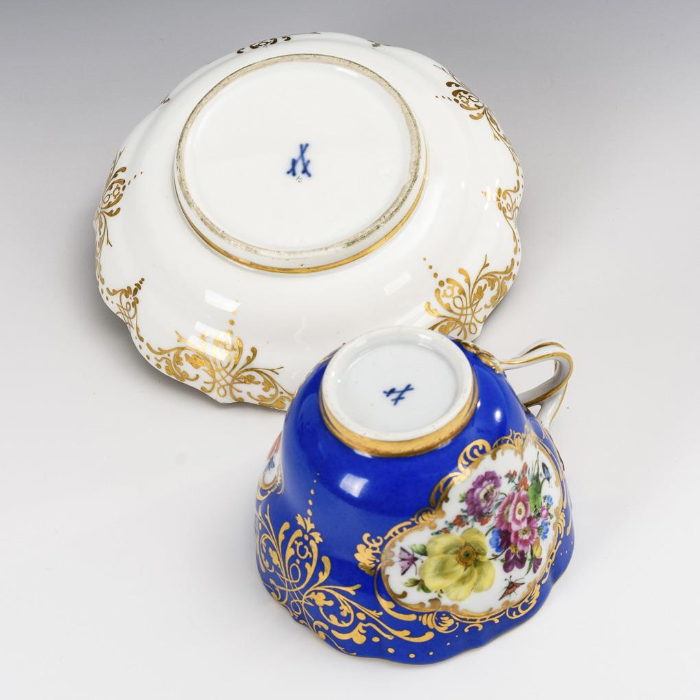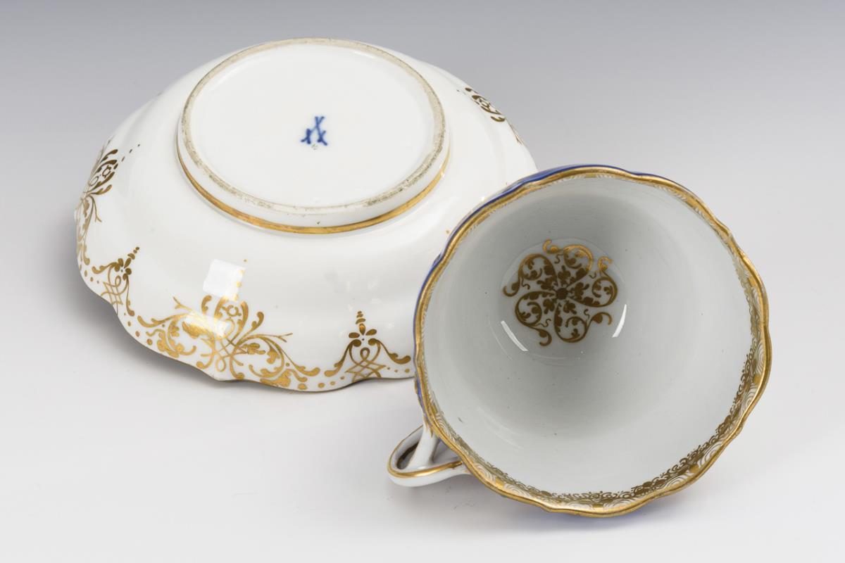 Glockentasse in der Form "Neuer Ausschnitt". Blauer Fond mit reicher ornamentaler Goldmalerei, polychrome Blumenbuketts in drei Vierpasskartuschen. Haarriss in der Untertasse.
