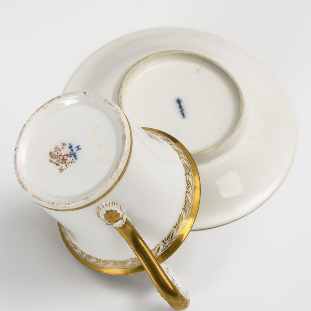 Malerei in Grautönen, Goldstaffage. H Tasse 10 cm, Ø ergänzte Untertasse 13,5 cm.