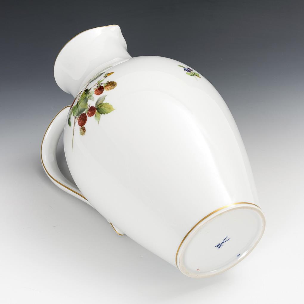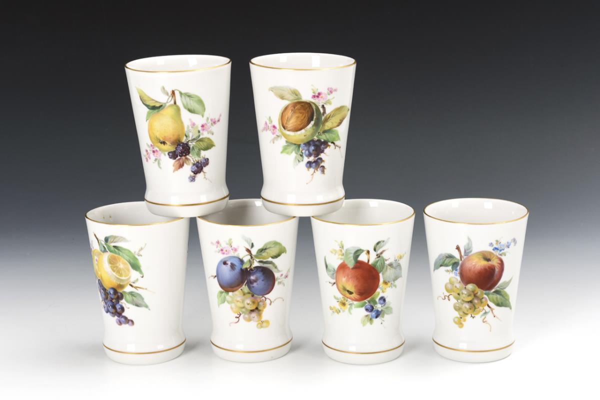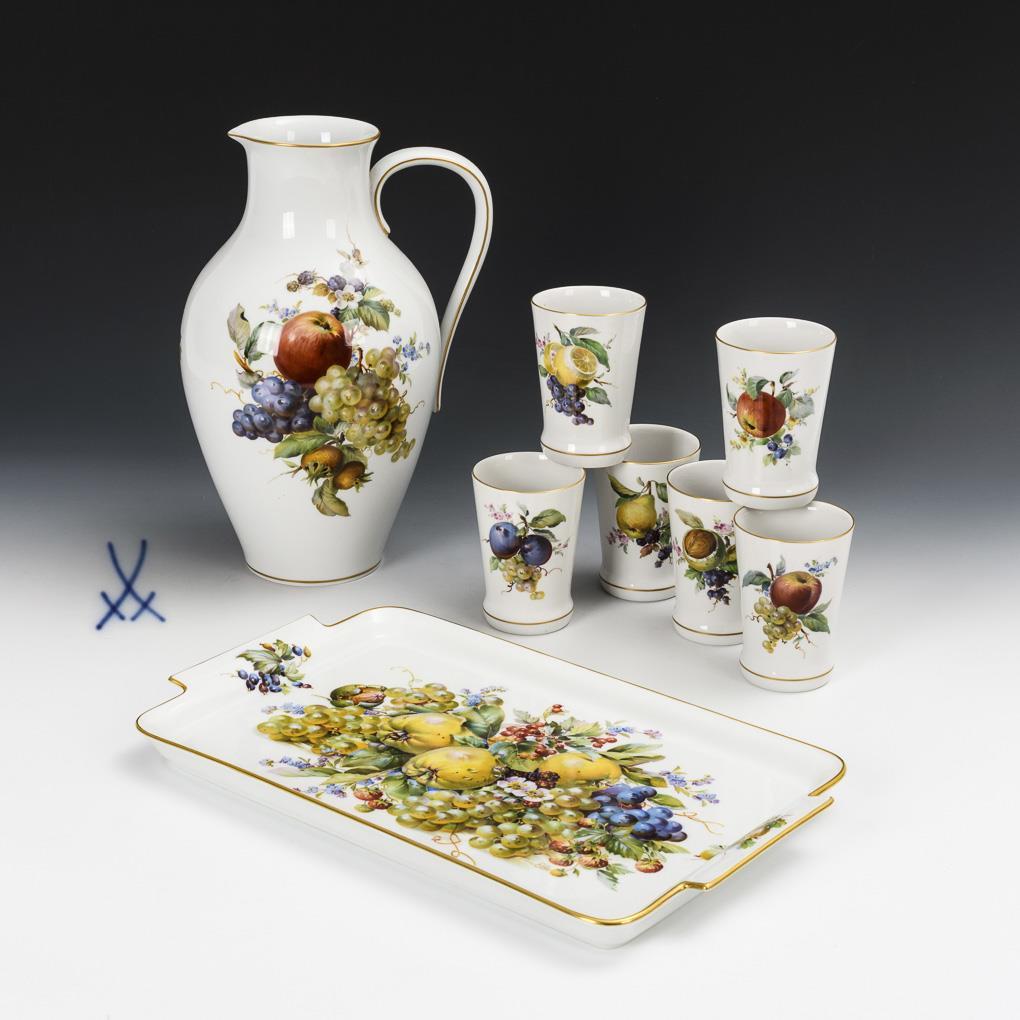 8 Teile. Mit reicher, leuchtend farbiger Fruchtmalerei. Saftkrug (H 31 cm), 6 konische Becher (H 10,5 cm) und 1 rechteckiges Tablett (23 x 39 cm).