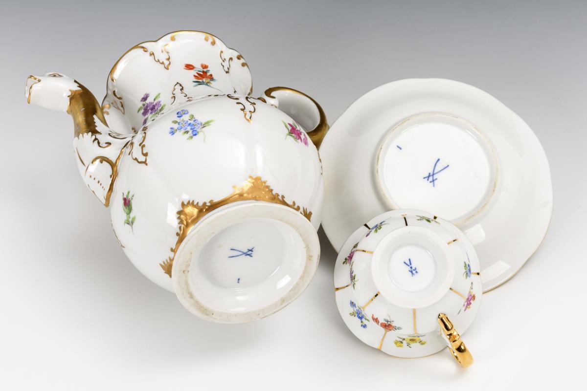 Mokkakanne "B-Form" mit Rociallerelief (H 19,5 cm). / Mokkatasse "B-Form" ohne Rocaillerelief (H 5 cm) mit Untertasse (Ø 13 cm). Mokkakanne mit herstellungsbedingten kleinen Fehlern in der Goldstaffage.