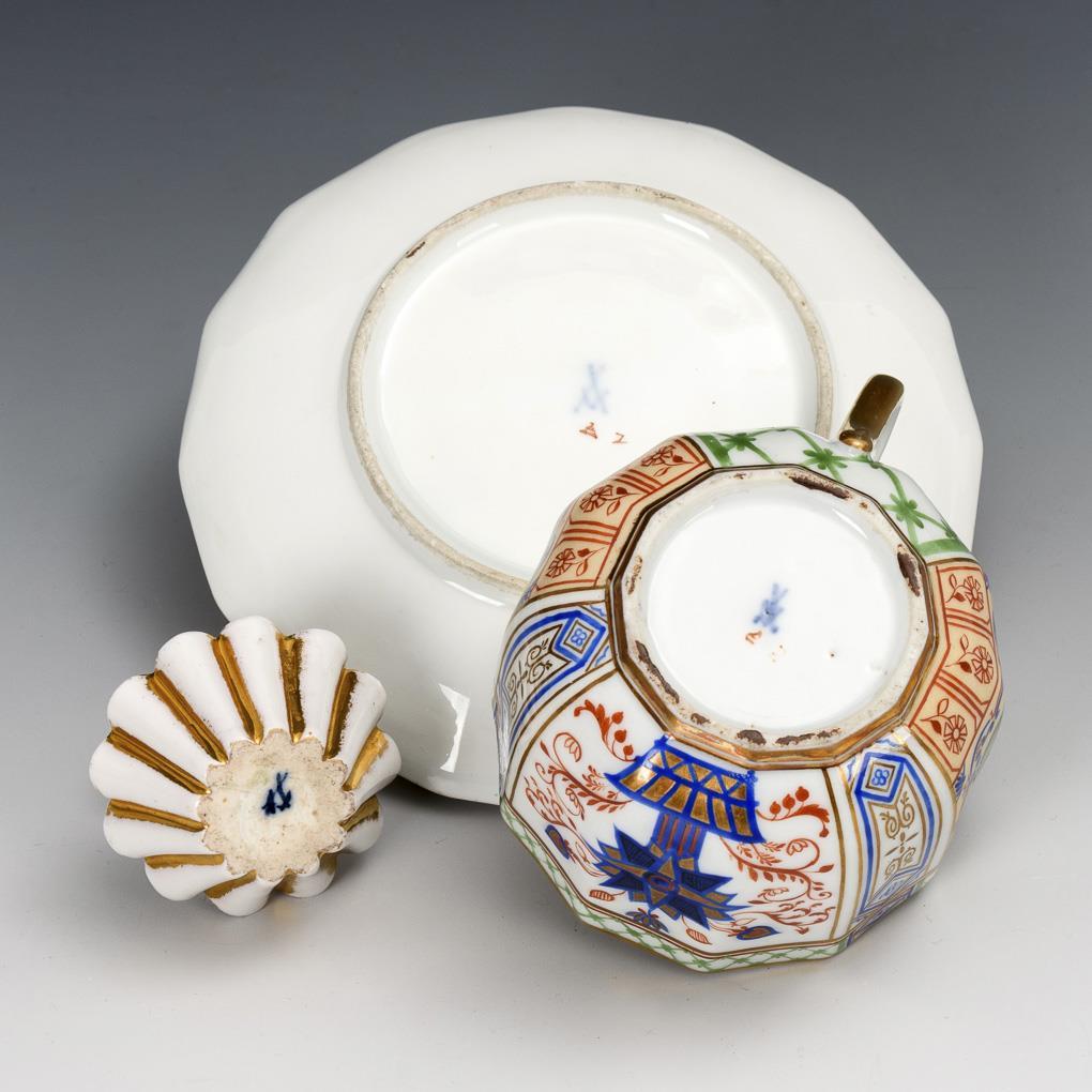 1x polygonale Tasse mit Ohrenhenkel und originaler Untertasse: gemaltes Ornamentdekor mit kleinen, stilisierten Chinoiserieszenen auf der Tasse. / 1x konischer, gerade godronierter Flakon mit Streublümchenmalerei. Partiell Gold berieben.
