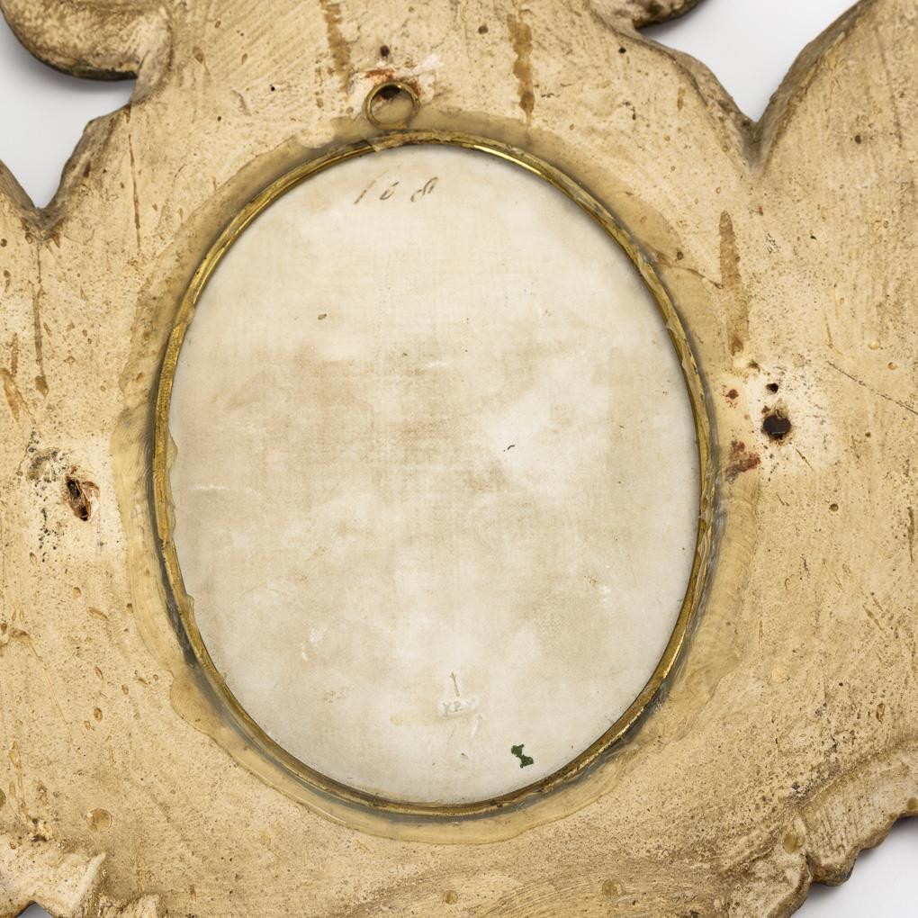 Polychrome Malerei. L Platte ca. 14 cm, im dekorativen, floral-ornamental reliefierten Holzrahmen (L 37,5 cm).
