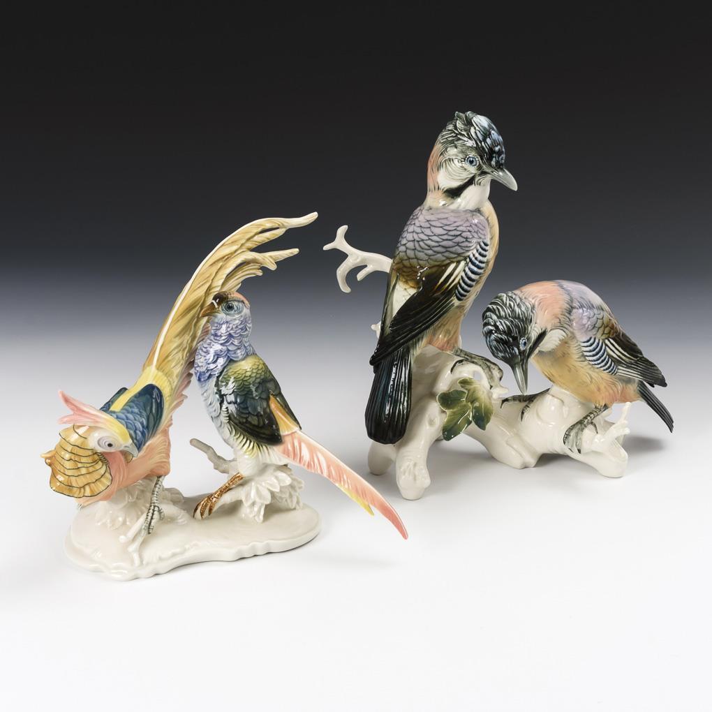 1x 2 Eichelhäher auf einem Astsockel. / 1x 2 Goldfasane auf einem Natursockel mit Zweigen.