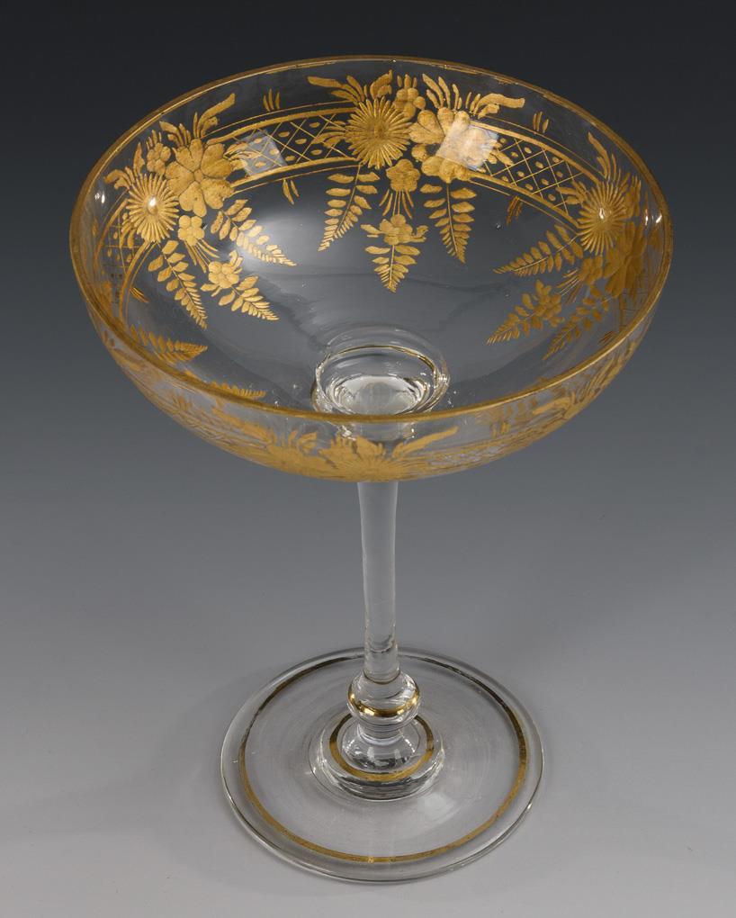 1x facettiertes Biedermeier-Kelchglas aus farblosem Glas mit rosa Innenfang (H 18,5 cm). / 1x Historismus-Pokal aus olivbraunem Glas mit der polychrom emailgemalten Darstellung eines Reiters (H 27 cm). / 1x Fußschale aus farblosem Glas mit goldstaffierter Floralgravur (H 19 cm). Partiell minimaler Goldabrieb, 2 minimale Bestoßungen am Kelchglases.