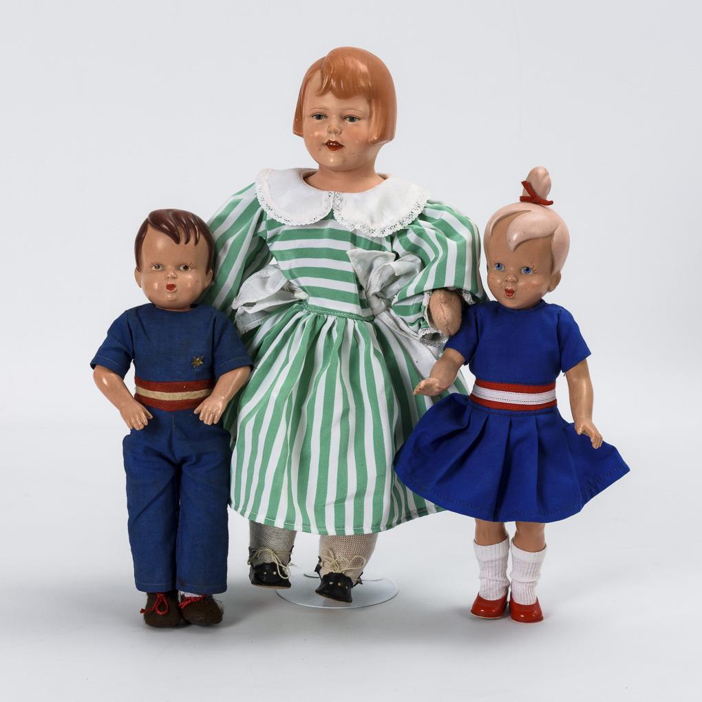 2 Tortulon-Puppen mit blauer Originalkleidung, Junge mit originalem Sternanstecker an der Brust. Aus den Jahren 1954/55, als Maskottchen der Kinderbeilage "Sternchen". Dazu Stoffpuppe mit Brustkopf aus Celluloid (ca. 1930er Jahre). In jünger ergänztem, grün-weiß gestreiftem Kleid. Leichte Altersspuren.
