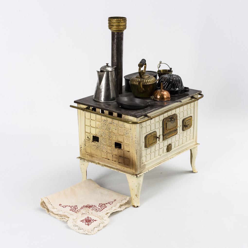Weiß lackierter Herd mit geprägter Front in Kacheloptik, 4 Kochstellen, Reling und 3 Ofenklappen. Seitliche Klappe mit 2 originalen Brennern. Dazu Wasserschiff, Kochgeschirr, 2 Wandborde, Backformen, Eimer und Porzellan. Bespielt, mit Altersspuren.