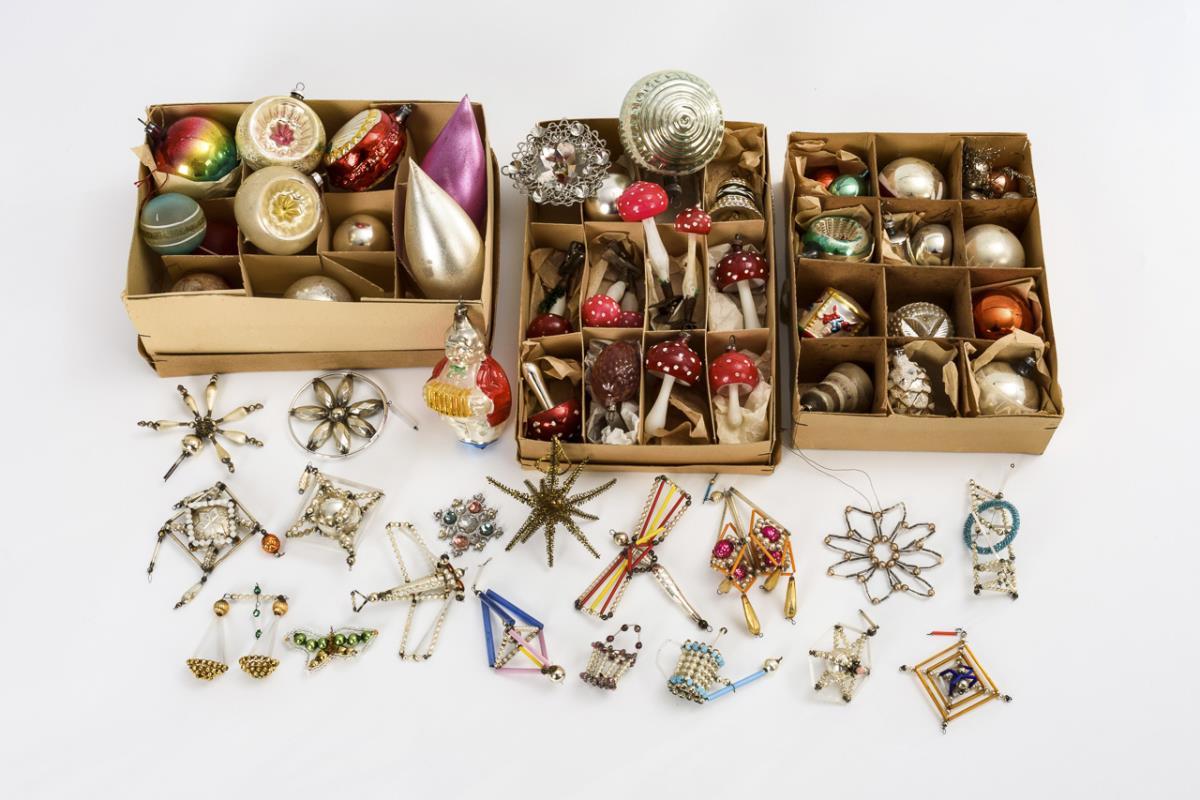 Verschiedene Weihnachtskugeln, Figuren und Ketten(fragmente), darunter Gablonzer Schmuck und Fliegenpilze. Altersspuren, kleine Defekte.
