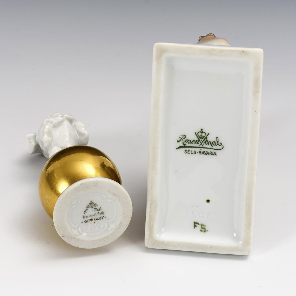 1x Modell-Nr. 205, Entwurf 1913 von Albert Caasmann: auf einer Schnecker reitender Putto (H 9 cm). / 1x Modell-Nr. 769, Entwurf 1933/34 von Theodor Kärner: aufwartender Hund auf einer goldenen Kugel (H 9 cm). Schneckenkopf restauriert.