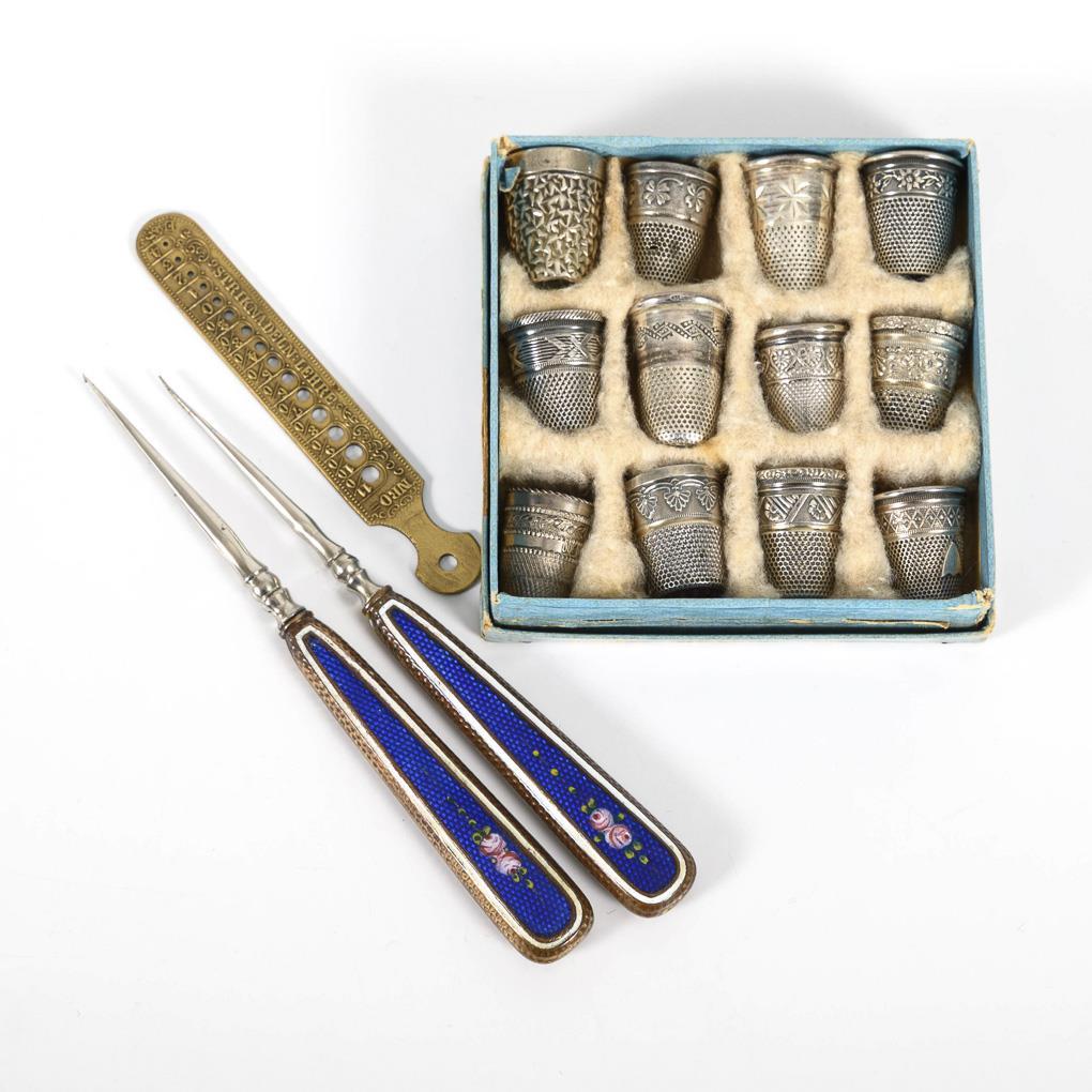 Verschieden gravierte Fingerhüte, teils mit verschiedenfarbigen Glasköpfen. Pendants Nadel und Ahle mit blauem Email über Guilloche und Rosenblüten. Sticknadeln Lehre "E&S" von Nr. 4 bis 11/0. Teils stärkere Alters-/Gebrauchsspuren.