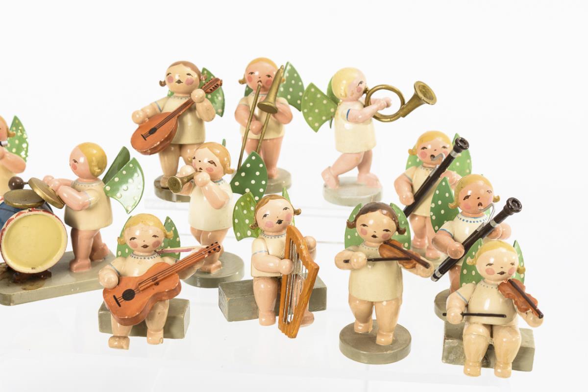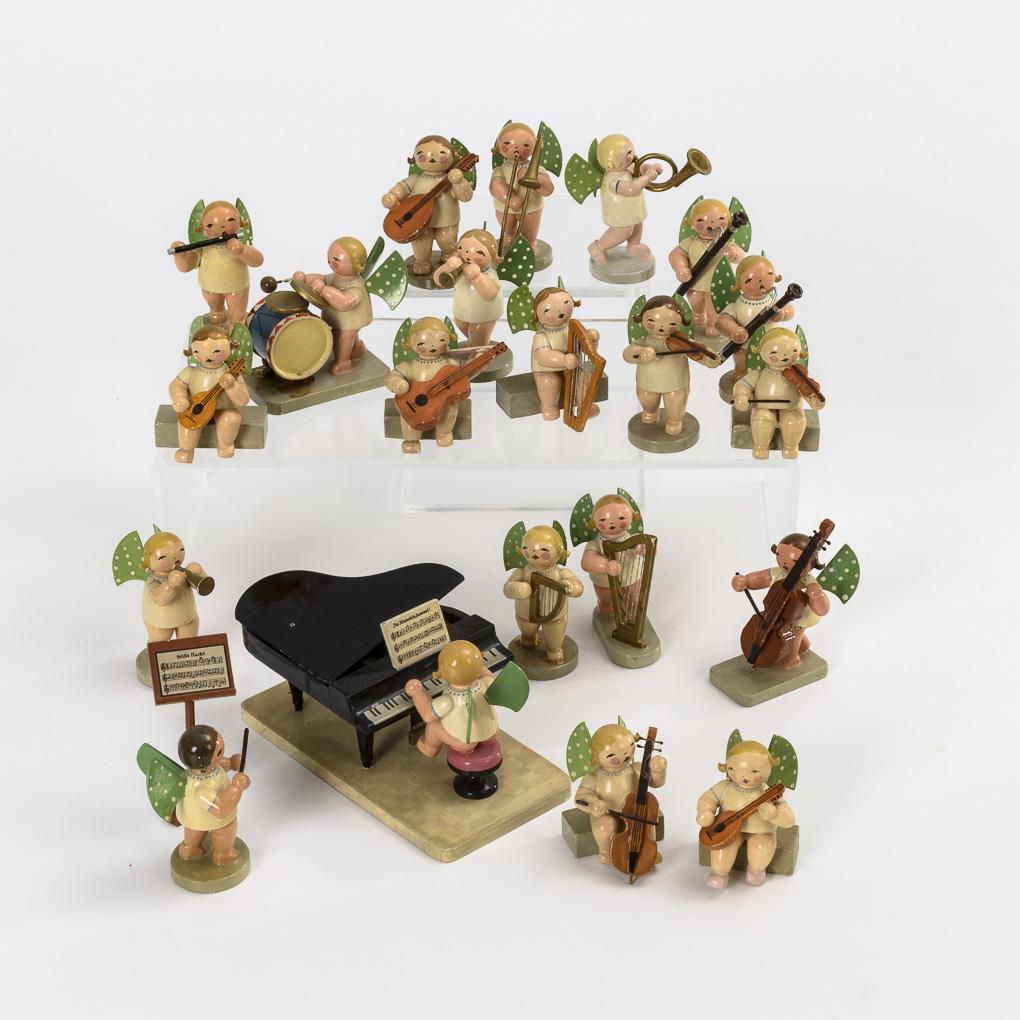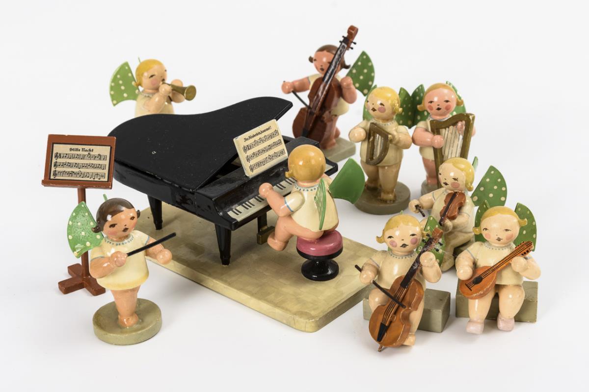 20 musizierende Engelchen und 1 Engel am Flügel. Wenige Klebestellen.