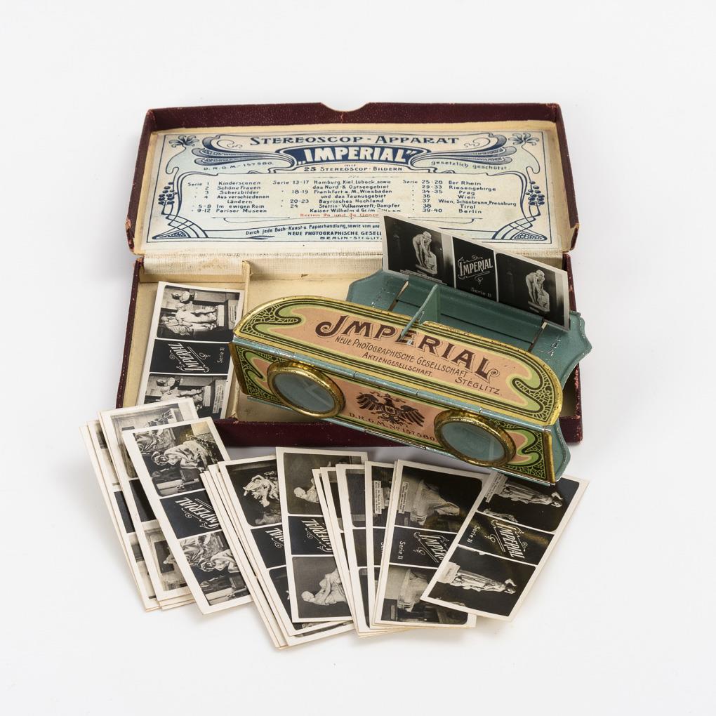 Kleines Taschen-Stereoskop mit 24 seltenen Originalbildern (Serie 11: "Pariser Museen"). In Originalkästchen. Minimale Altersspuren.